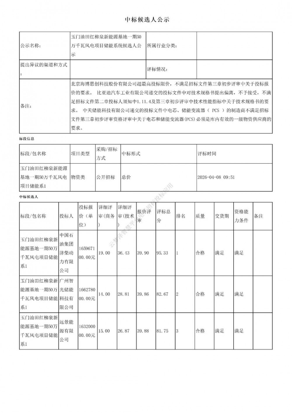 第一中标候选人为中国石油集团济柴动力有限公司,投标报价16596.71万元,折合单价约0.5186元/Wh;第二中标候选人:广州智光储能科技有限公司,投标报价16627.8万元,折合单价约0.5196元/Wh;第三中标候选人:远景能源有限公司,投标报价16320万元,折合单价约0.5100元/Wh。