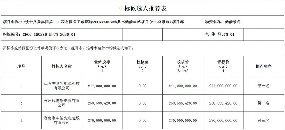 第一中标候选人为江苏季晴新能源科技有限公司,投标报价为244000000元,折合单价0.61元/Wh;第二中标候选人为苏州远博新能源有限公司,投标报价为258533420元,折合单价0.6463元/Wh;第三中标候选人为湖南湘中输变电建设有限公司,投标报价为270000000元,折合单价0.675元/Wh。