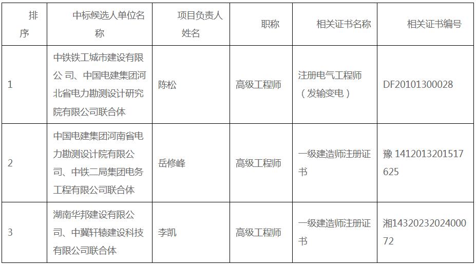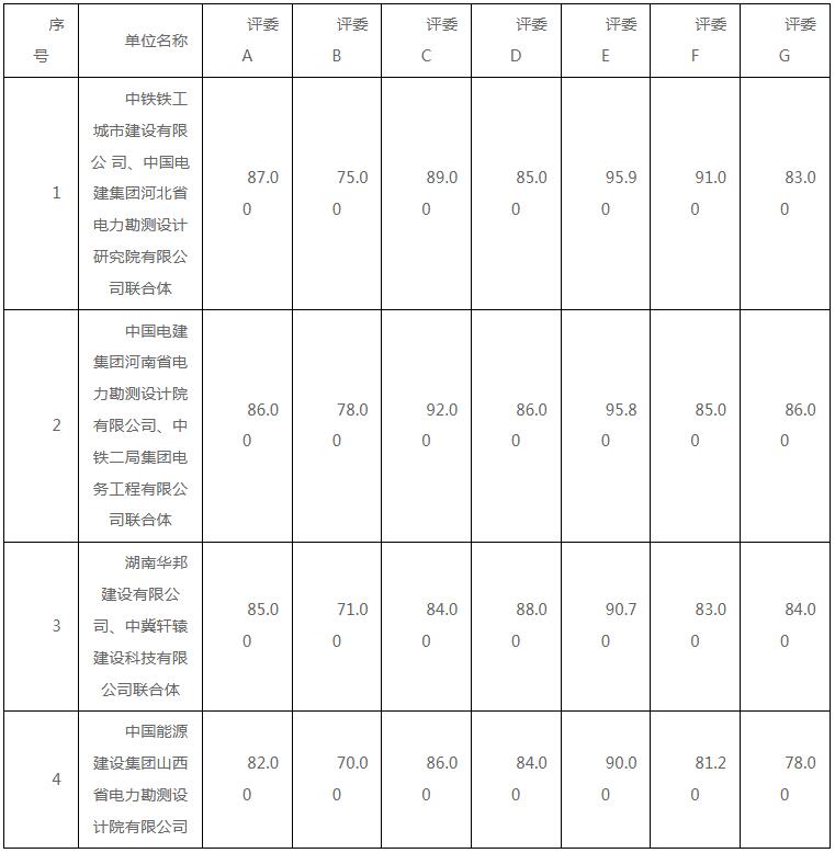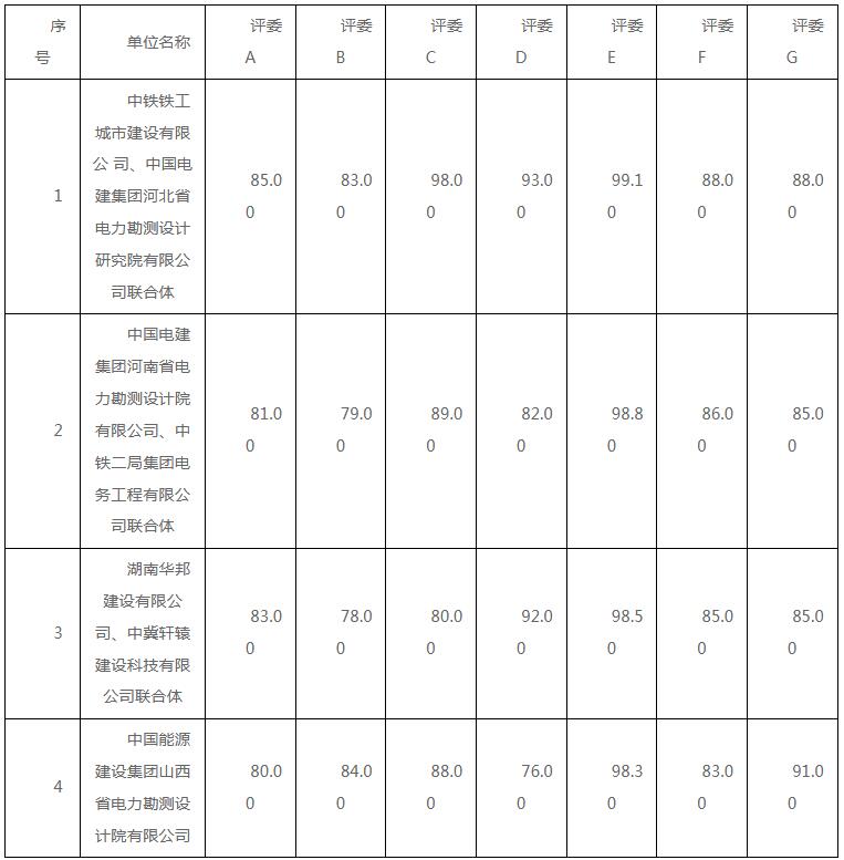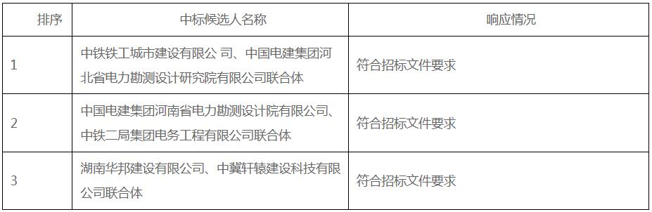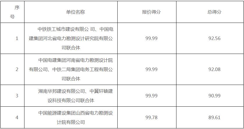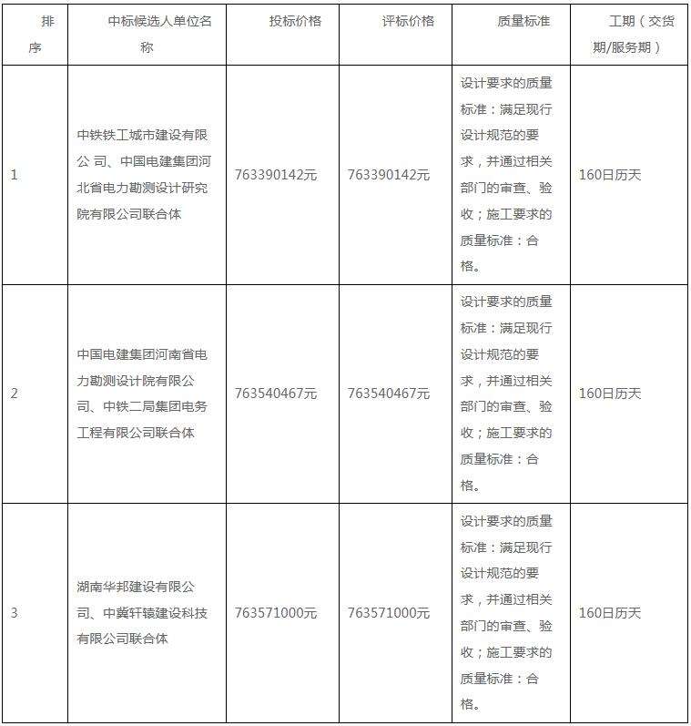 第一中标候选人为中铁铁工城市建设有限公司、中国电建集团河北省电力勘测设计研究院有限公司联合体,投标报价为763390142元,折合单价1.06元/Wh;第二中标候选人为中国电建集团河南省电力勘测设计院有限公司、中铁二局集团电务工程有限公司联合体,投标报价为763540467元,折合单价1.0602元/Wh;第三中标候选人为湖南华邦建设有限公司、中冀轩辕建设科技有限公司联合体,投标报价为763571000元,折合单价1.0602元/Wh。