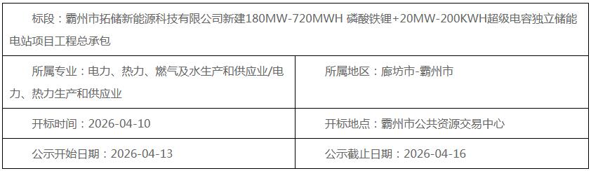 4月13日,霸州市拓储新能源科技有限公司新建180MW-720MWH磷酸铁锂+20MW-200KWH超级电容独立储能电站项目工程总承包中标候选人公示。