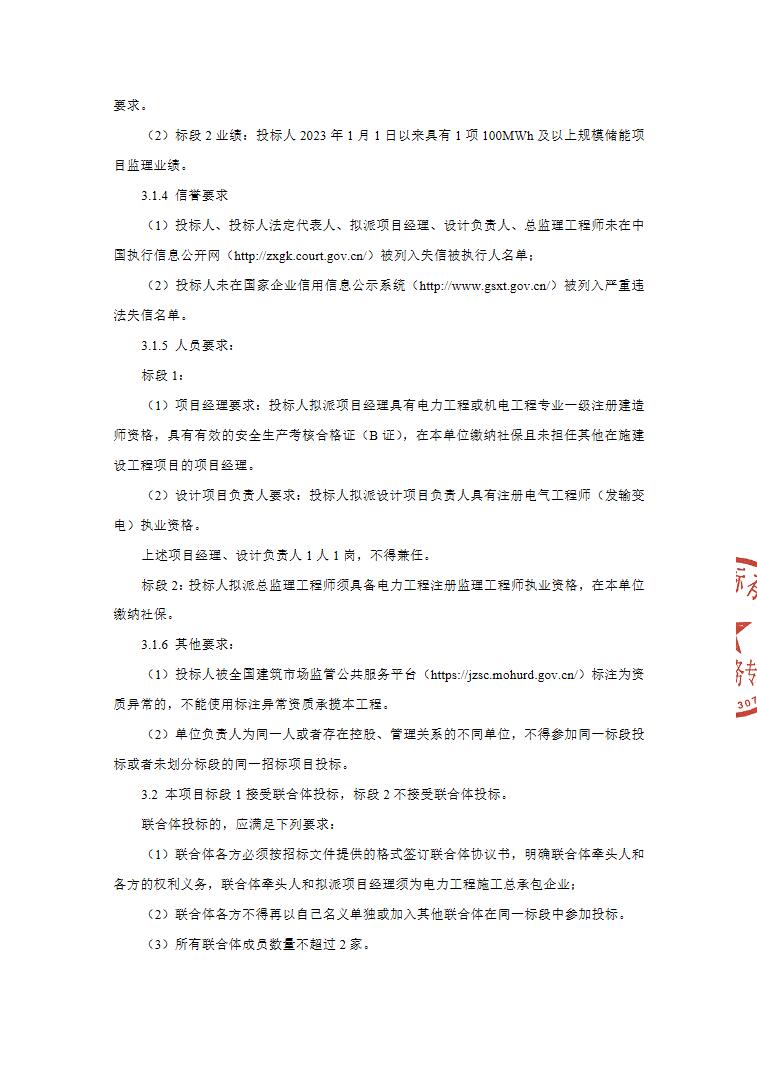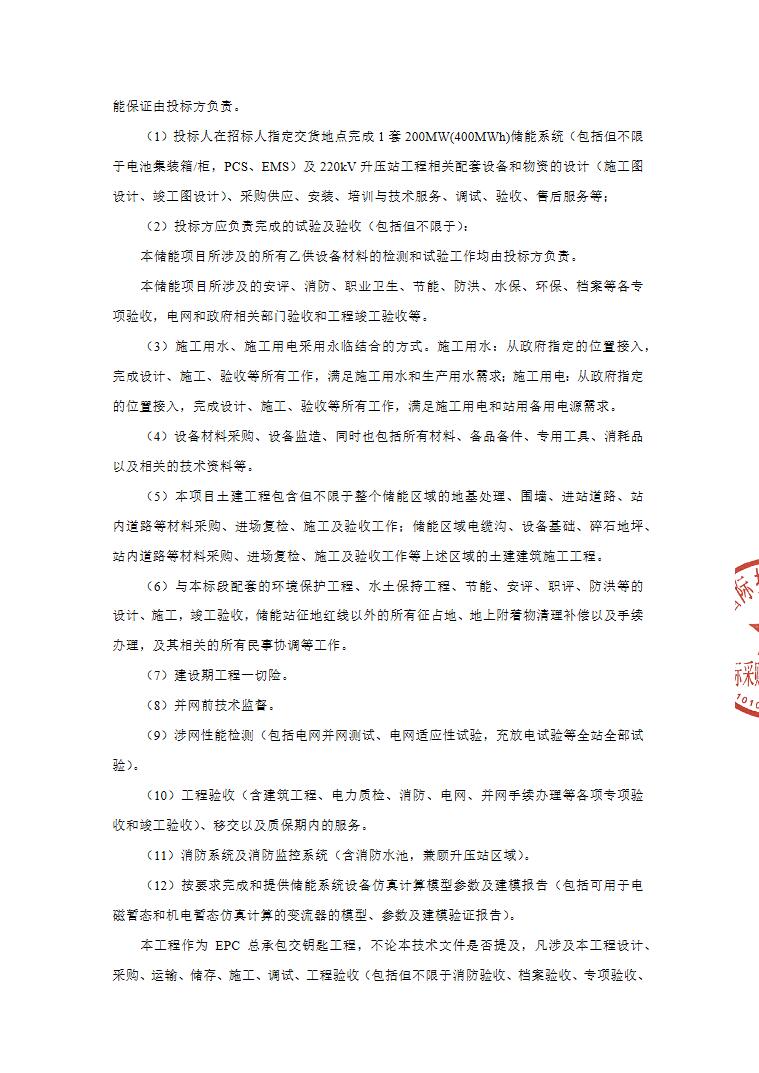 标段1为项目场地清表及三通一平,项目所有设备及材料采购,储能站区建筑及安装工程,220kV升压站建筑及安装工程,外送线路建筑及安装工程,对侧220kV出线间隔扩建工程。项目试验调试及检查测试(含到货抽检、电网要求的所有并网试验、调试及相关手续)、验收资料移交等工作,开工及并网手续的办理。