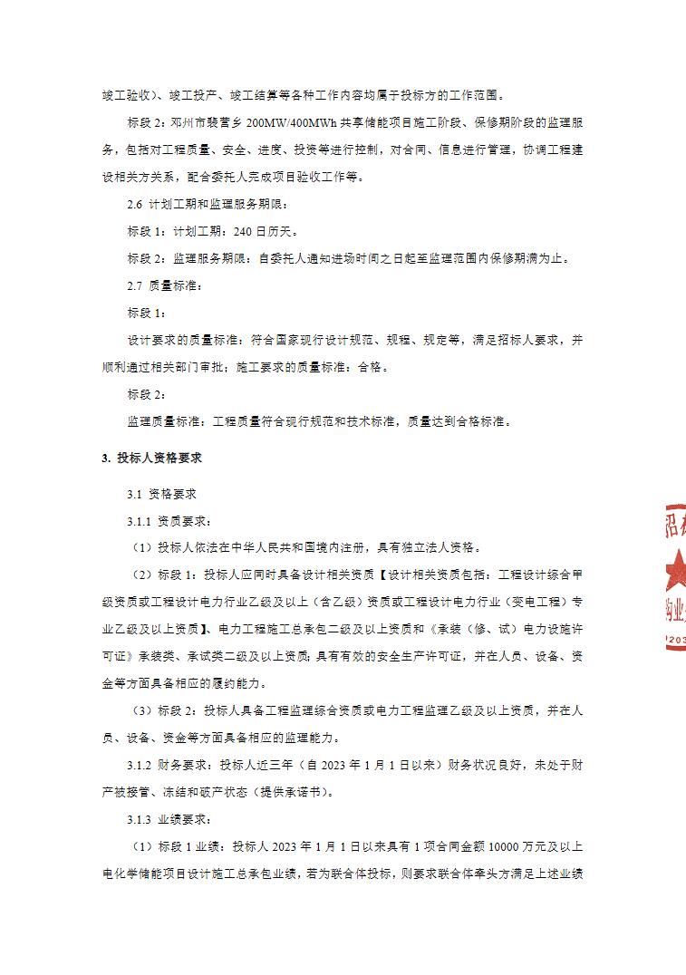 标段为邓州市裴营乡200MW/400MWh共享储能项目施工阶段、保修期阶段的监理服务,包括对工程质量、安全、进度、投资等进行控制,对合同、信息进行管理,协调工程建设相关方关系,配合委托人完成项目验收工作等。
