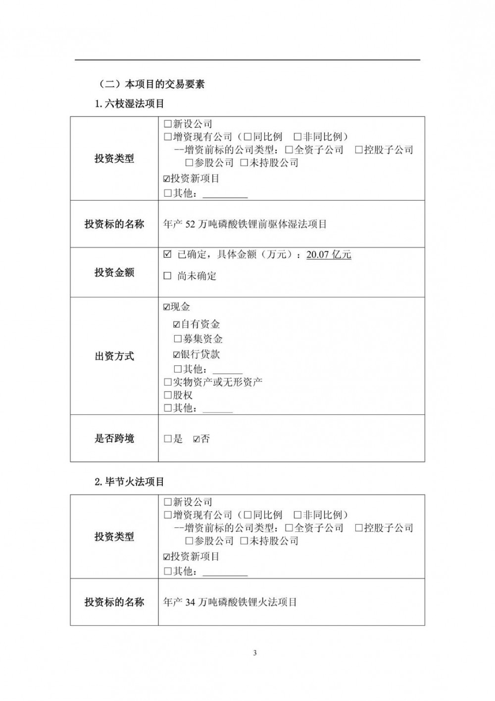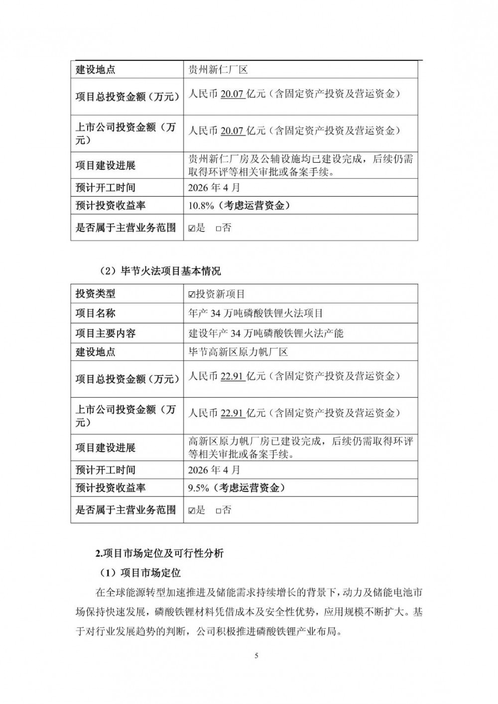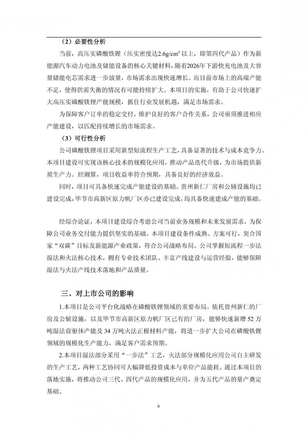 六枝湿法项目:在贵州新仁新能源科技有限公司原有的厂房(位于贵州省六盘水市六枝特区)投资建设年产52万吨磷酸铁锂前驱体湿法项目,由公司并购的贵州新仁负责实施,预计投资约20.07亿元(固定投资11.68亿元,流动资金8.39亿元)。