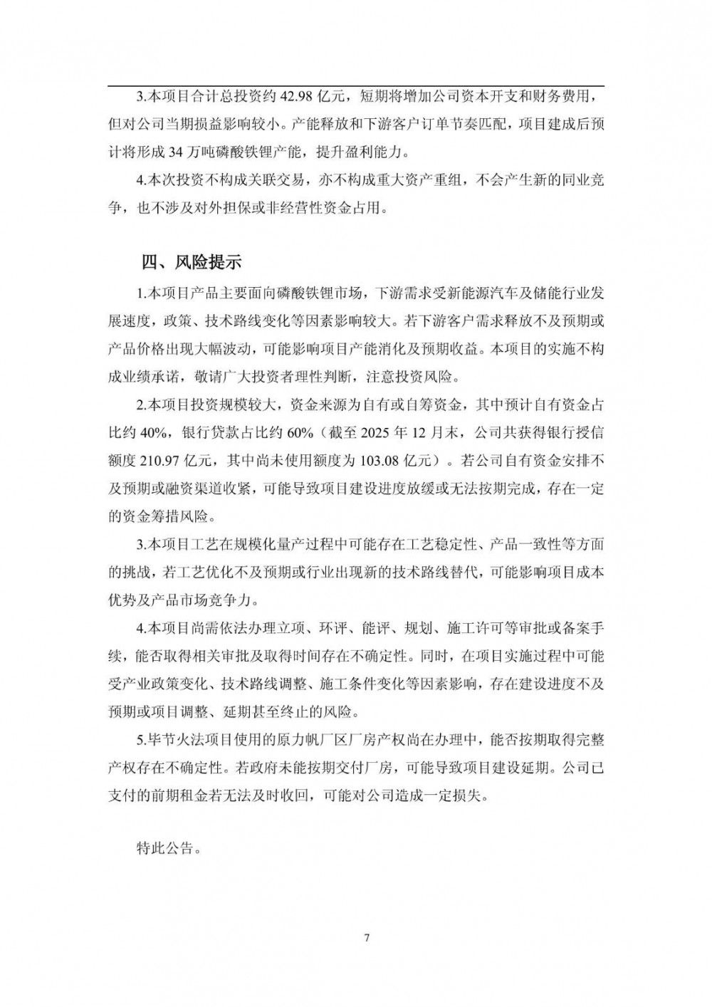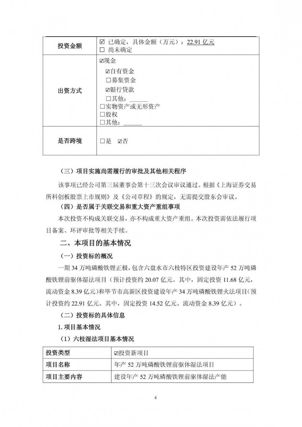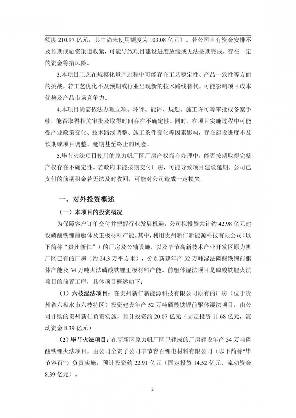 六枝湿法项目:在贵州新仁新能源科技有限公司原有的厂房(位于贵州省六盘水市六枝特区)投资建设年产52万吨磷酸铁锂前驱体湿法项目,由公司并购的贵州新仁负责实施,预计投资约20.07亿元(固定投资11.68亿元,流动资金8.39亿元)。