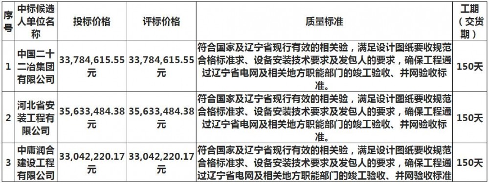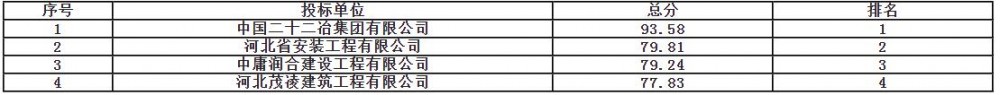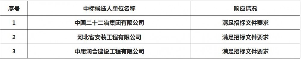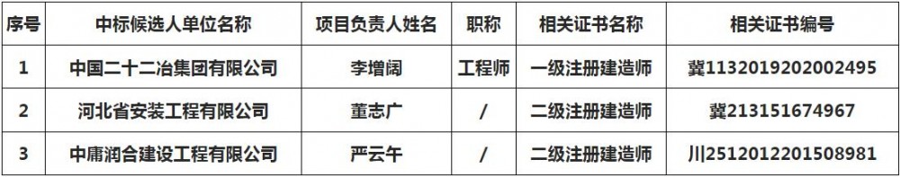 第一中标候选人为中国二十二冶集团有限公司,投标报价为33784615.55元;第二中标候选人为河北省安装工程有限公司,投标报价为35633484.38元;第三中标候选人为中庸润合建设工程有限公司,投标报价为33042220.17元。