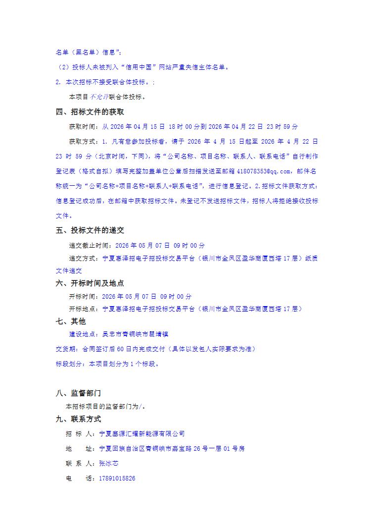 4月15日,宁夏塞源汇耀新能源有限公司100MW/400MWh独立储能电站项目公开招标公告发布。