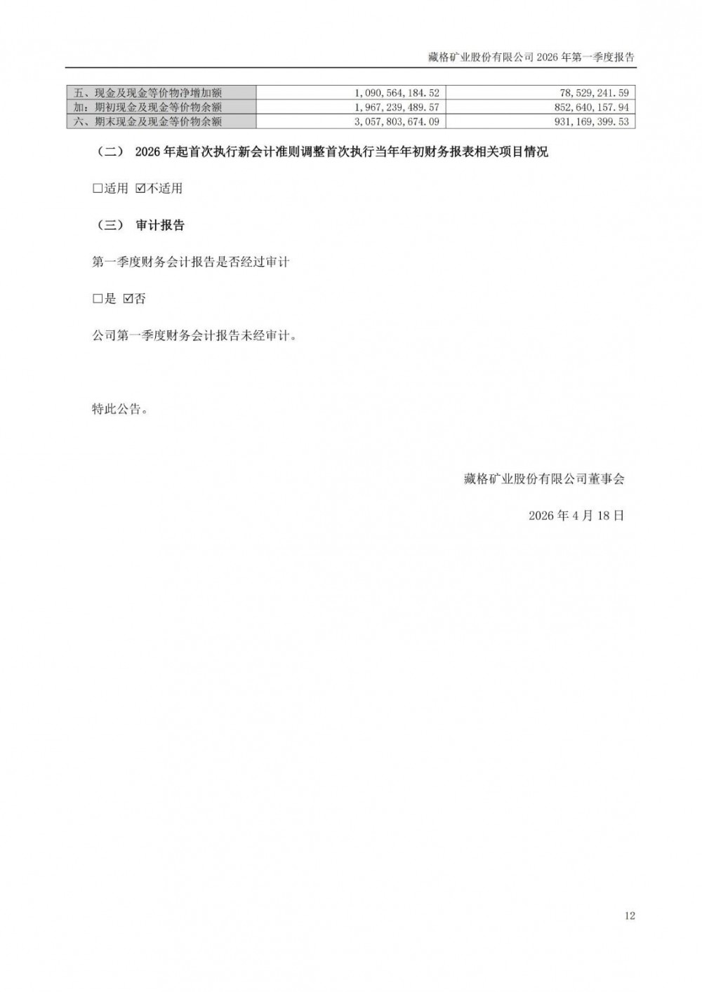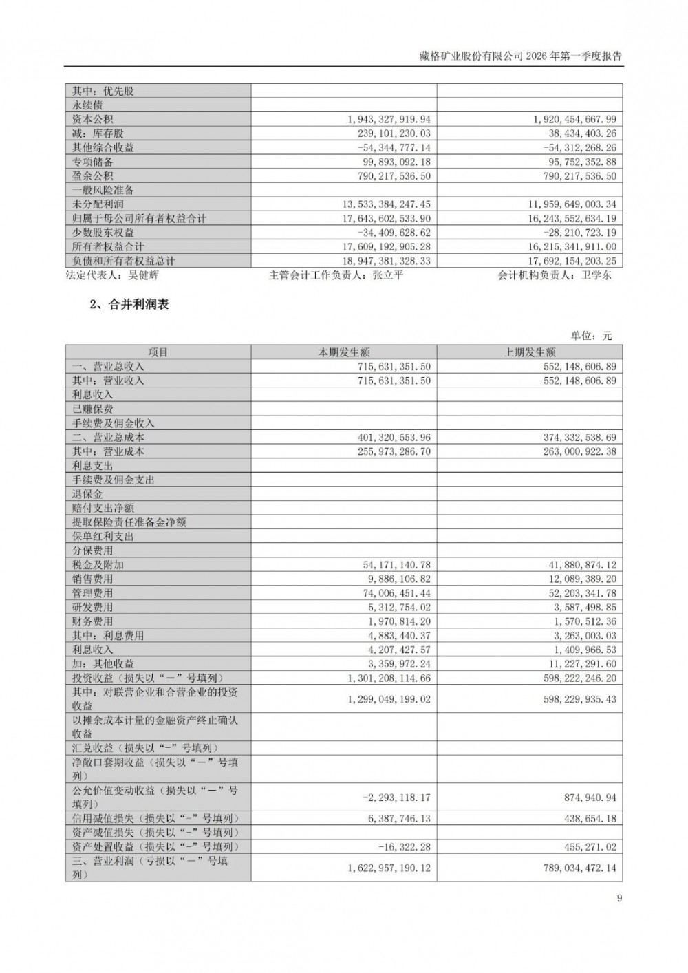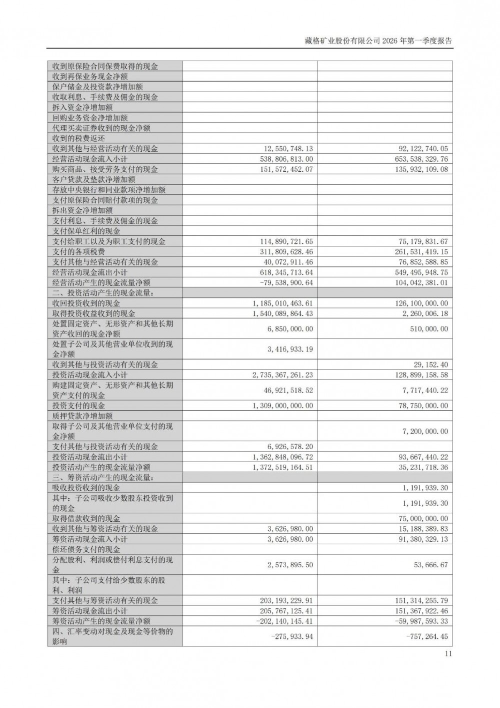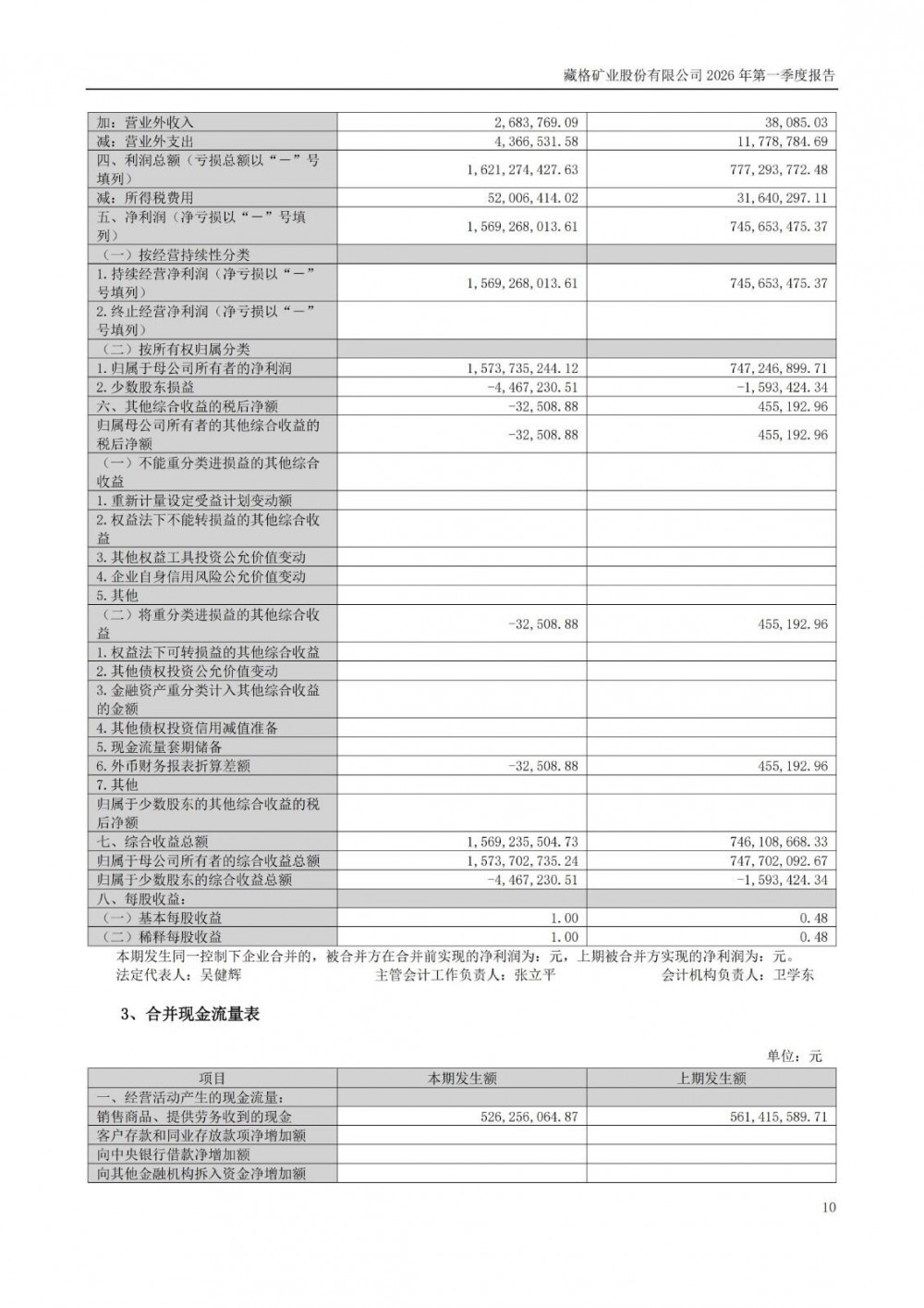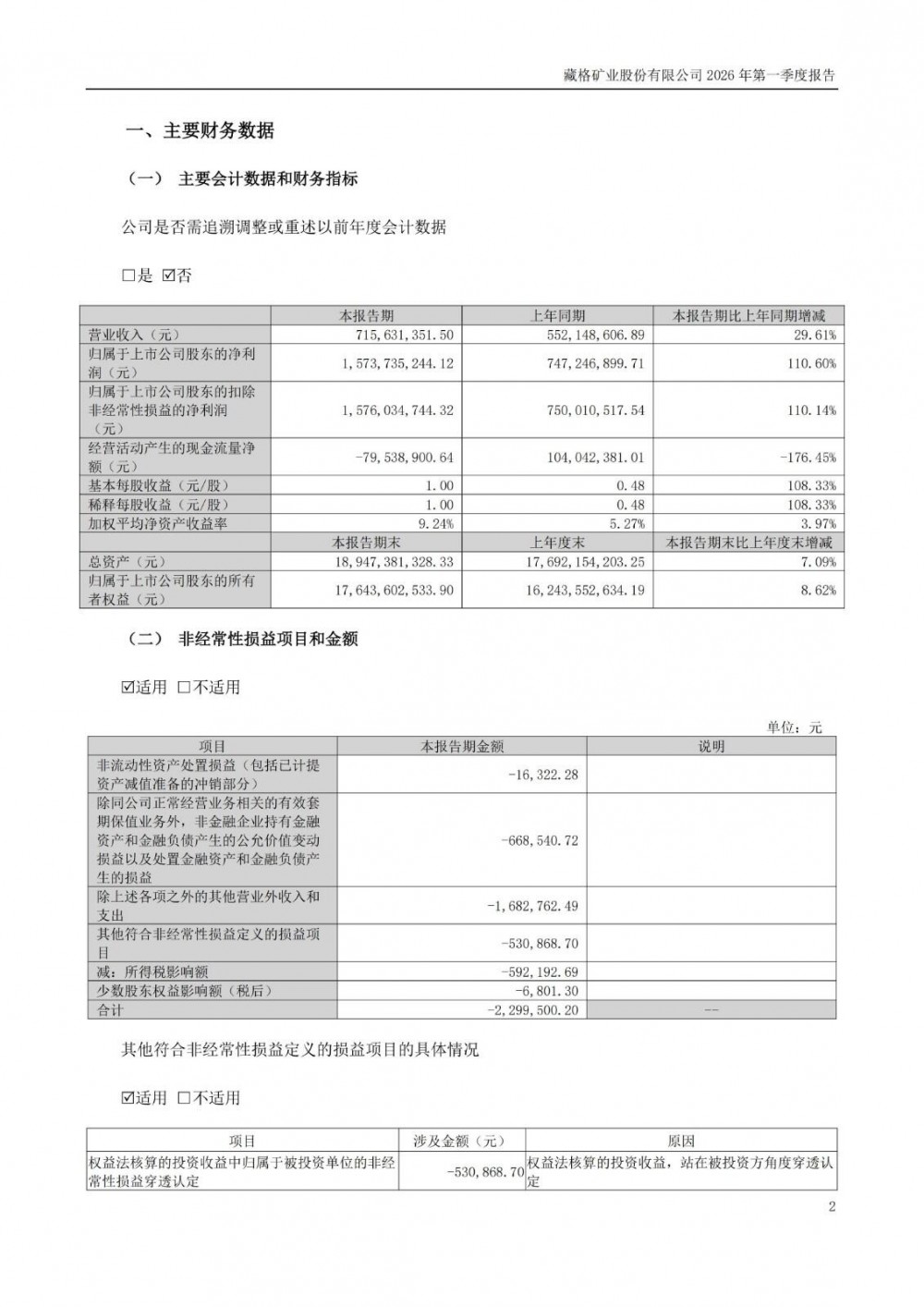 近日,藏格矿业发布2026年一季度报告。2026年一季度公司实现营业总收入7.16亿元,同比增长29.61%;归母净利润15.74亿元,同比增长110.60%;扣非净利润15.76亿元,同比增长110.14%;经营活动产生的现金流量净额为-7953.89万元,上年同期为1.04亿元。