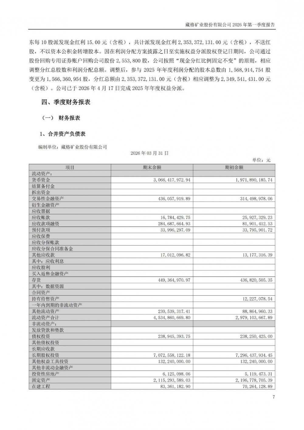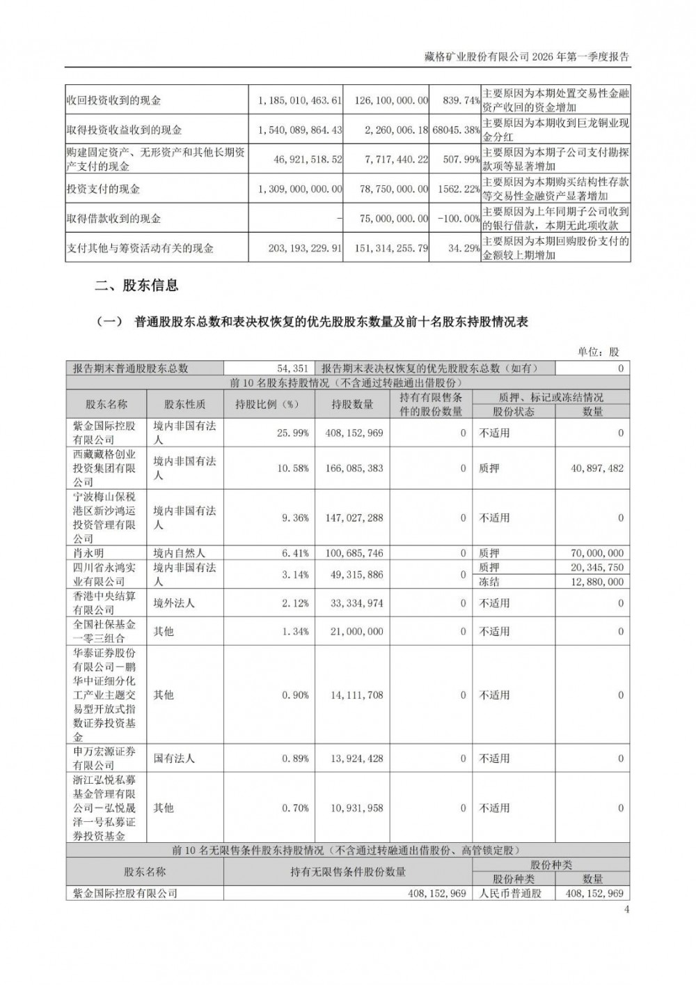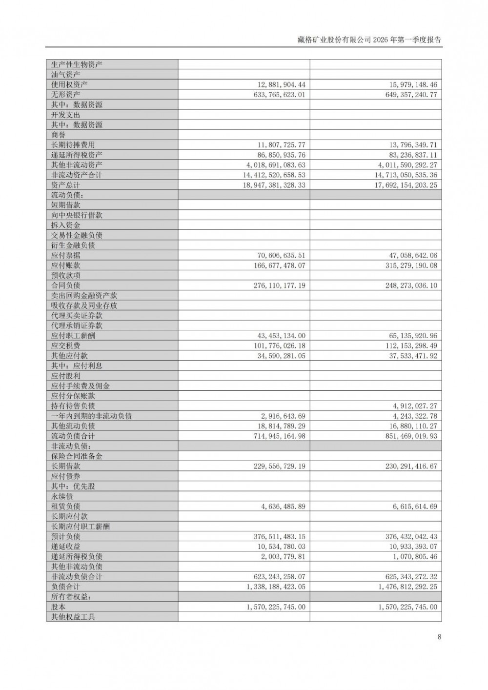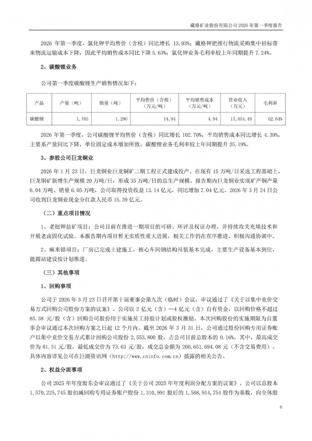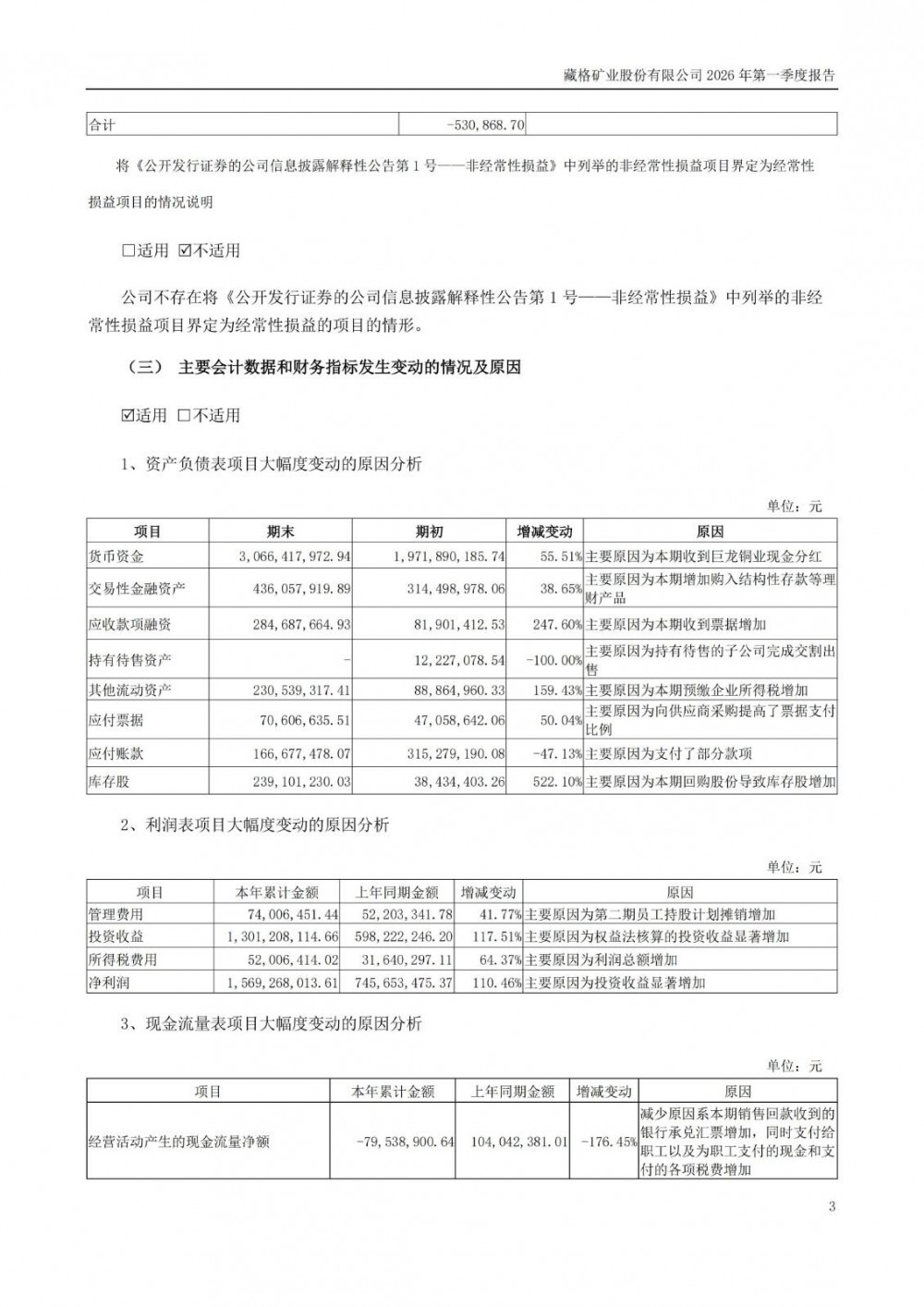 近日,藏格矿业发布2026年一季度报告。2026年一季度公司实现营业总收入7.16亿元,同比增长29.61%;归母净利润15.74亿元,同比增长110.60%;扣非净利润15.76亿元,同比增长110.14%;经营活动产生的现金流量净额为-7953.89万元,上年同期为1.04亿元。