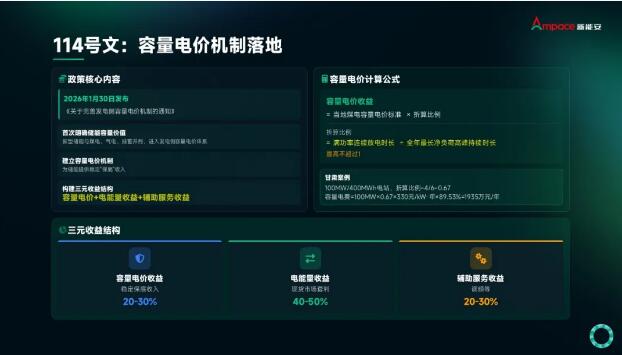 针对市场化转型下的收益重构,新能安储能事业部中国区总裁马金鹏博士重点解读2026年1月30日发布的114号文《关于完善发电侧容量电价机制的通知》。该政策首次将新型储能与煤电、气电、抽水蓄能并列,纳入发电侧容量电价体系,为储能提供稳定的保底收益。