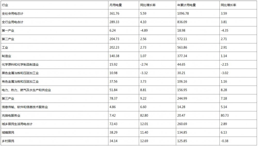 3月份,全省全社会用电量361.76亿千瓦时,同比增长5.59%。其中,第一产业用电量6.24亿千瓦时,同比减少4.89%;第二产业用电量204.73亿千瓦时,同比增长2.56%;第三产业用电量78.37亿千瓦时,同比增长9.22%;城乡居民生活用电量72.43亿千瓦时,同比增长12.01%。全省全社会年累计用电量1096.78亿千瓦时,同比增长3.59%。具体分行业用电量情况见表2:
