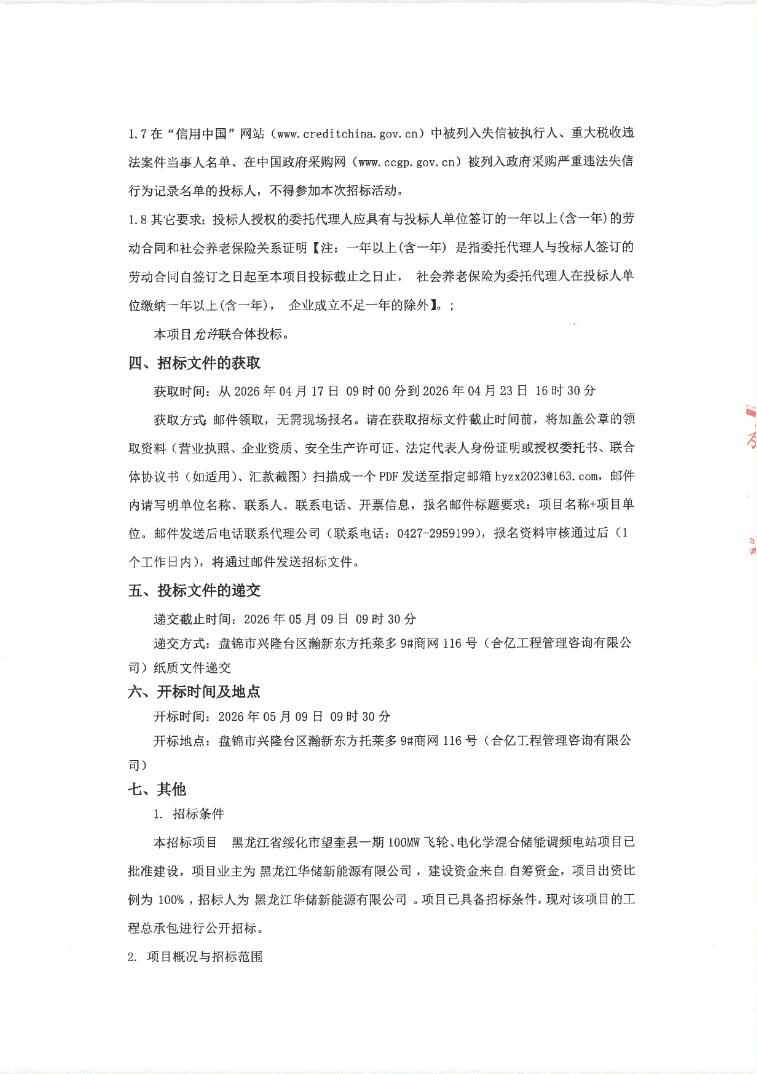 近日,黑龙江省绥化市望奎县一期100MW飞轮、电化学混合储能调频电站项目总承包(EPC)招标公告发布。