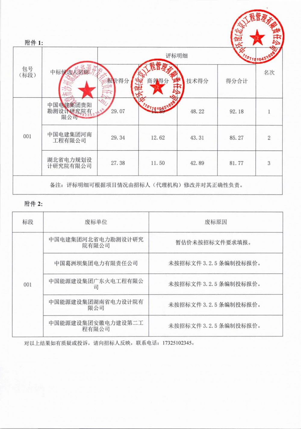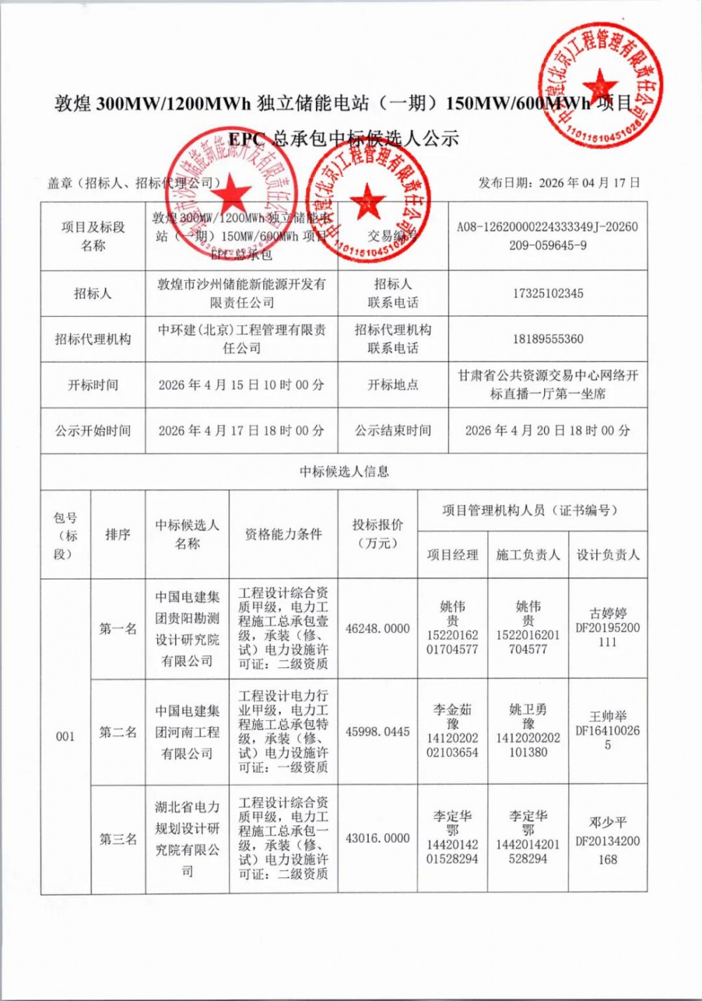 第一中标候选人为中国电建集团贵阳勘测设计研究院有限公司,投标报价为46248万元,折合单价0.7708元/Wh;第二中标候选人为中国电建集团河南工程有限公司,投标报价为45998.0445万元,折合单价0.7666元/Wh;第三中标候选人为湖北省电力规划设计研究院有限公司,投标报价为43016万元,折合单价0.7169元/Wh。
