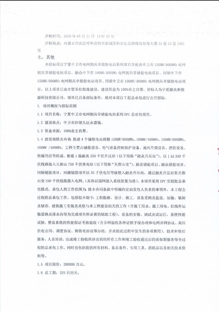 项目由宁夏融炎新能源科技有限公司作为招标人,建设地点位于中卫市沙坡头区永康镇,项目限价20亿元,总工期225日历天。