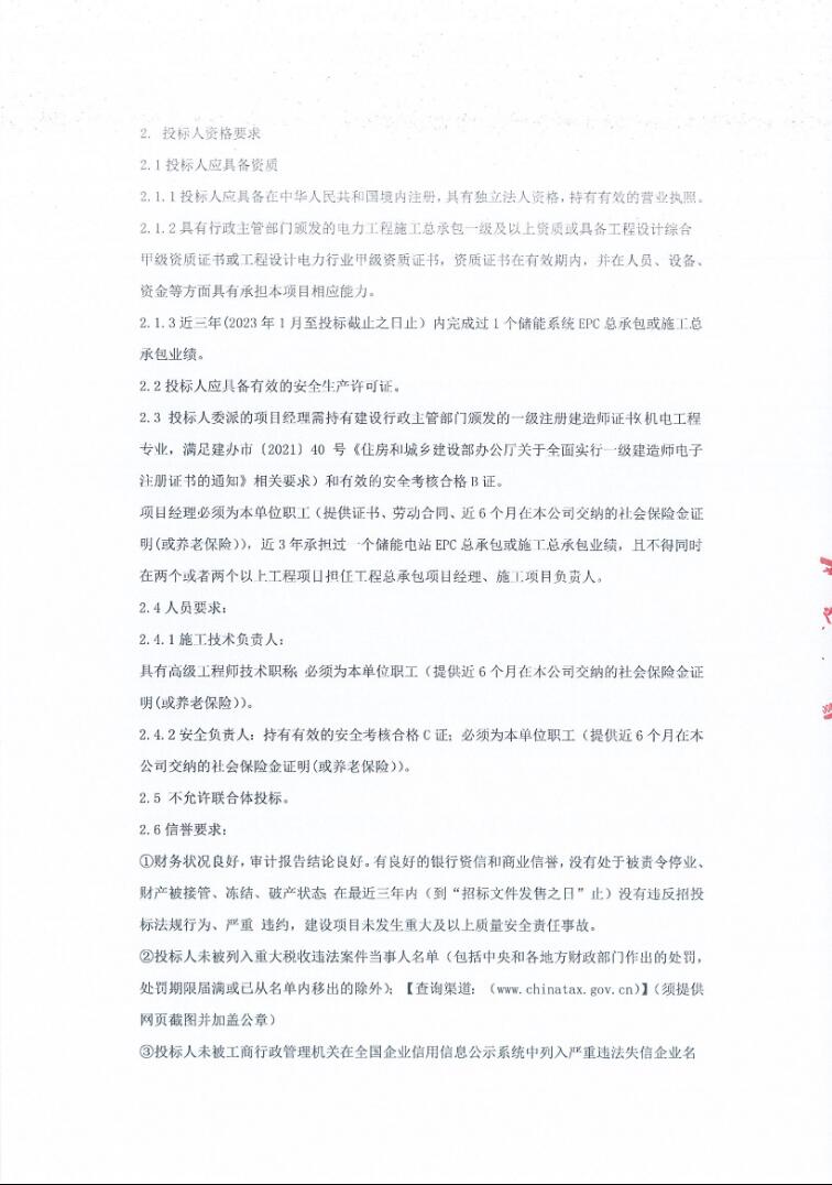 投标人近三年需完成过1个储能系统EPC总承包或施工总承包业绩。项目不接受联合体投标。