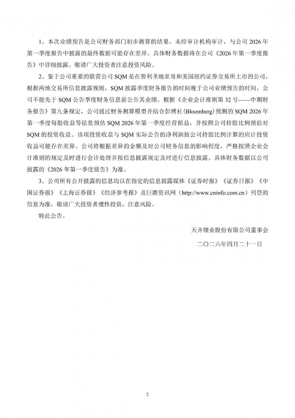 资讯来源:天齐锂业