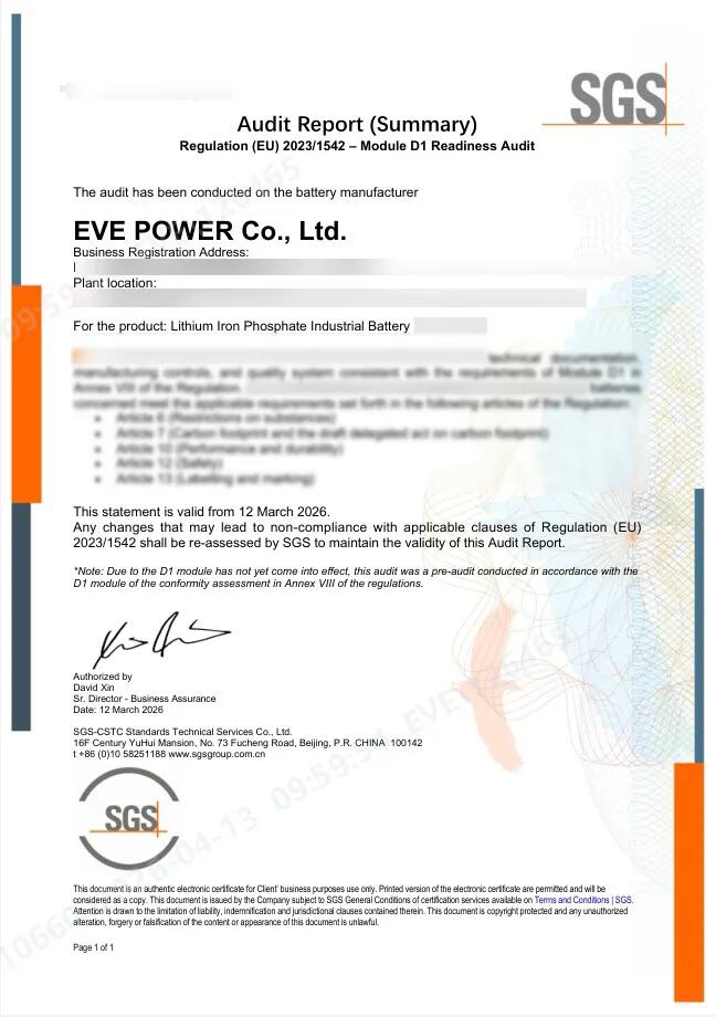 4 月 17 日,亿纬锂能储能大电池 Mr.Big 正式获颁 SGS 欧盟电池法(EU)2023/1542 合格性评定 D1 模式深度核查证书。这一里程碑式成果,不仅标志着 Mr.Big 符合当前严苛的欧盟电池法合规要求,更彰显了亿纬锂能在储能大电池领域的技术硬实力、完善的电池法质量管控能力及可持续发展理念,为公司深耕全球高端储能市场、巩固行业领先地位筑牢了电池法合规根基。