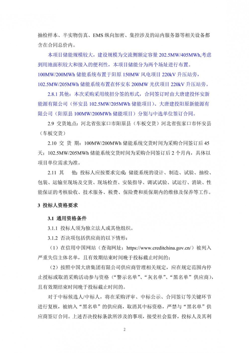 4月21日,大唐河北蔚县电厂基地(二期)202.5MW405MWh新能源配建储能项目磷酸铁锂电池系统招标公告发布。
