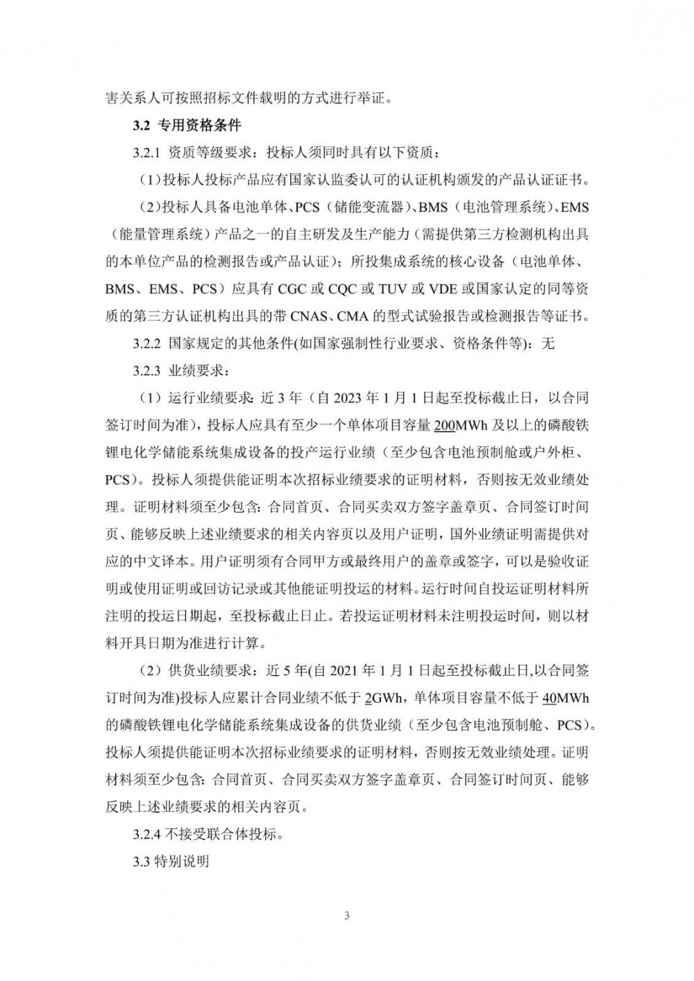 近5年(自2021年1月1日起至投标截止日,以合同签订时间为准)投标人应累计合同业绩不低于2GWh,单体项目容量不低于40MWh的磷酸铁锂电化学储能系统集成设备的供货业绩(至少包含电池预制舱、PCS)。