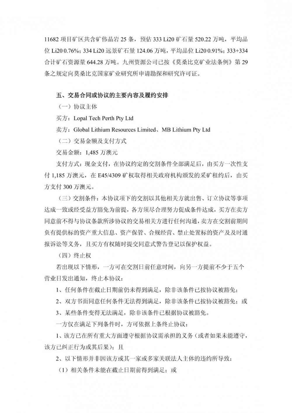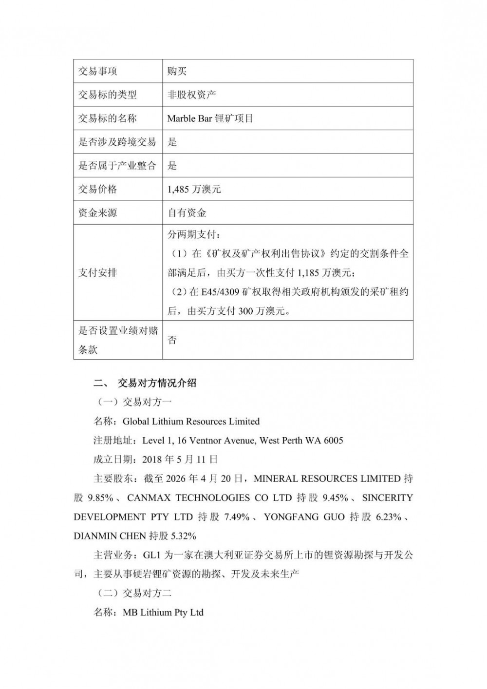 4月21日,龙蟠科技发布公告称,公司通过境外全资子公司 Lopal Tech Perth Pty Ltd与 GlobalLithiumResourcesLimited、MB LithiumPty Ltd签署《Tenements andMineral RightsSaleAgreement》。根据协议,龙蟠珀斯以1,485万澳元的交易对价收购GL1与MB锂业持有的位于澳大利亚的锂矿勘探租约及相关资产。
