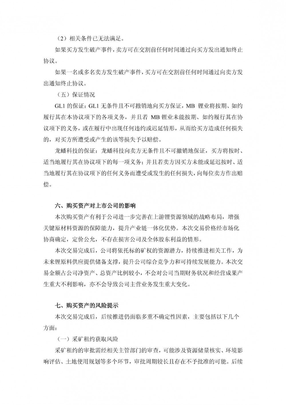 本次交易完成后,龙蟠科技将依托标的矿权的资源潜力,持续推进相关工作,为未来锂原料供应提供储备支撑,提升公司综合竞争力和可持续发展能力。本次交易金额占公司净资产、总资产比例较小,不会对公司当期财务状况和经营成果产生重大不利影响,亦不会导致公司主营业务发生重大变化。