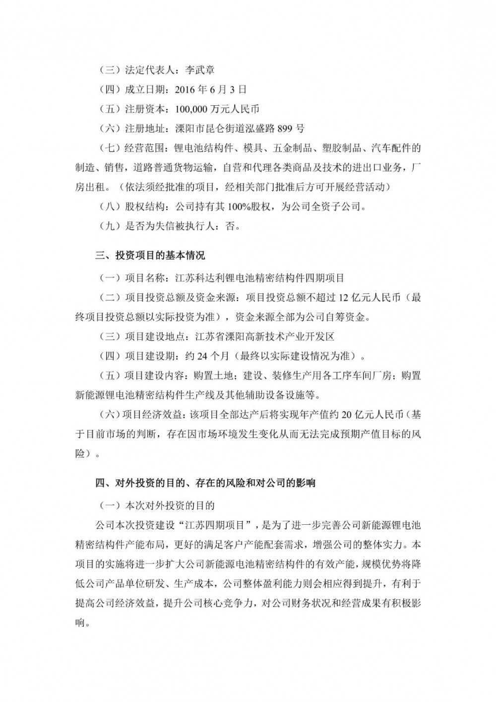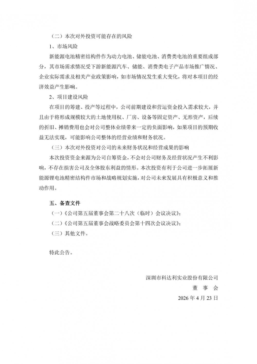 科达利表示,本次投资资金来源为公司自筹资金,不会对公司财务及经营状况产生不利影响,不存在损害公司及全体股东利益的情形。本次投资有利于公司进一步拓展新能源锂电池精密结构件市场和战略规划实施,对公司未来发展具有积极意义和推动作用。