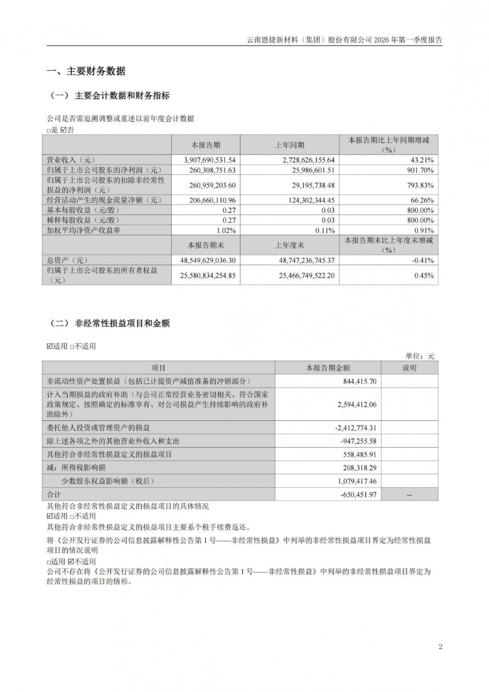 4月22日,恩捷股份发布2026年第一季度报告。公司实现营业总收入39.08亿元,同比增长43.21%;归母净利润2.6亿元,同比增长901.70%。