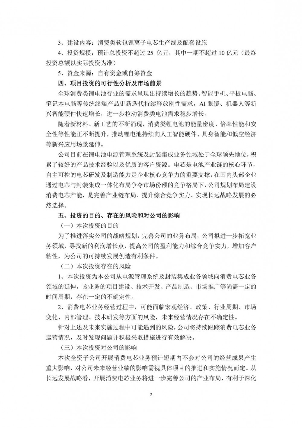 德赛电池表示,本次全资子公司开展消费电芯业务预计短期内不会对公司的经营成果产生重大影响,对公司未来经营业绩的影响需视具体项目的推进和实施情况而定。从长远发展战略看,开展消费电芯业务将进一步完善公司的产业布局,有利于深化与客户的合作,强化公司的市场地位,对公司的未来发展有积极作用。