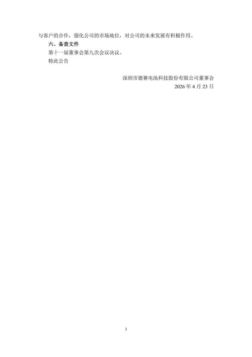 4月22日,德赛电池发布公告称,为了推进落实公司战略规划、完善产业布局,巩固消费类业务市场份额,公司全资子公司惠州市德赛电池有限公司拟开展消费电芯业务,分期新建消费类软包锂离子电芯生产线及配套设施,项目达产后将形成年产2亿只消费类软包锂离子电芯产能,预计投资额不超过25亿元;其中:第一期将于2027年底前建成年产6,000万只消费类软包锂电芯产能,对应投资额不超过10亿元。