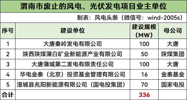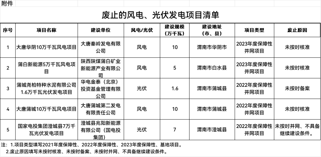根据项目清单,渭南市2021-2023年度保障性项目拟废止风电、光伏发电项目共5个,规模合计336MW。