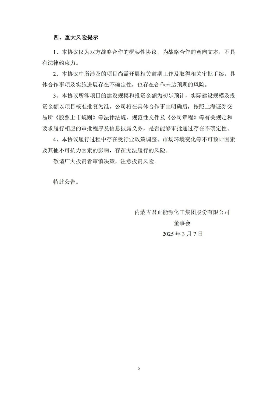 公告称,2025年3月6日,君正集团与阿拉善盟行政公署签署了《阿拉善风光制氢及绿色能源一体化项目战略合作框架协议》。