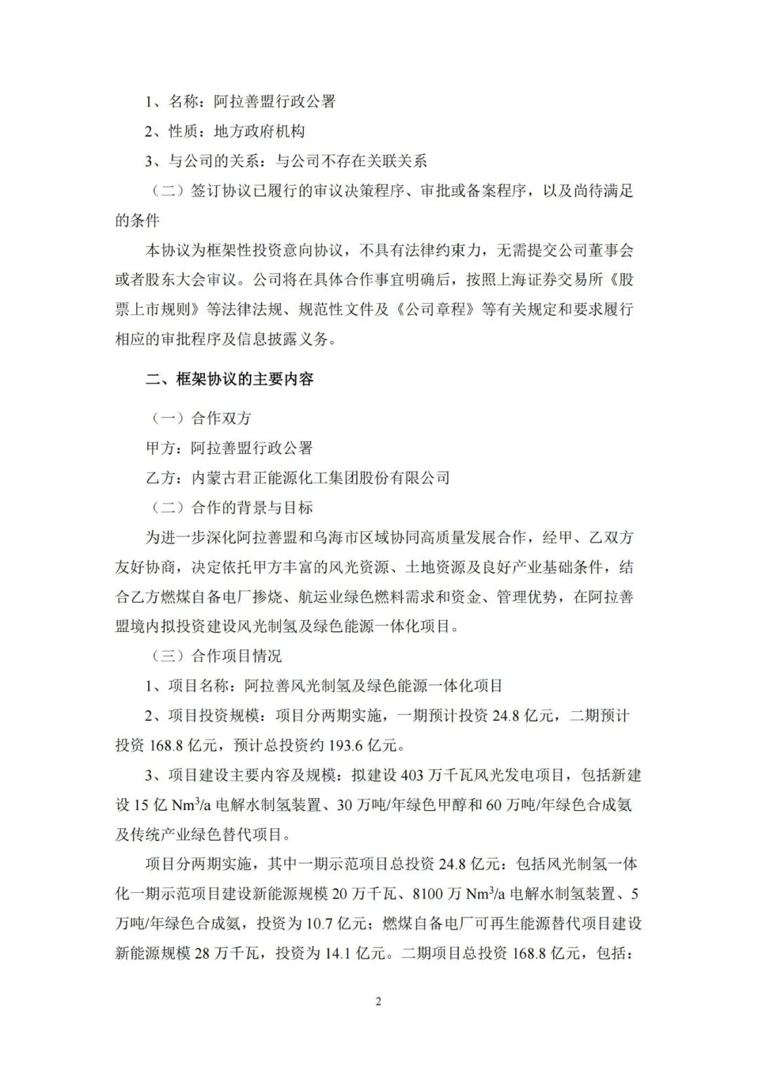 获悉,3月7日,内蒙古君正能源化工集团股份有限公司(简称:君正集团)发布关于签署《阿拉善风光制氢及绿色能源一体化项目战略合作框架协议》的公告。