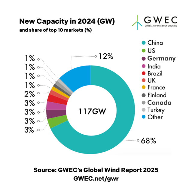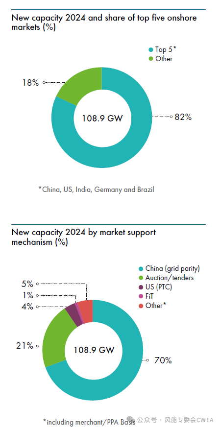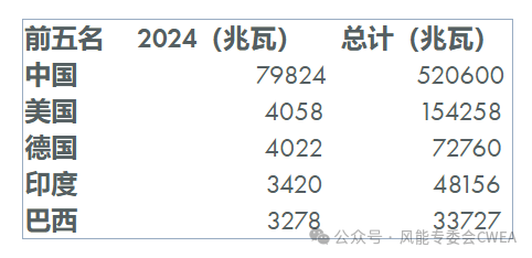 2024年,中国的新增装机继续在全球领先,其次是美国和德国,印度与巴西也位居前五。截至2024年底,这五个市场也是全球累积风电装机量的前五名,巴西在去年超过了西班牙。
