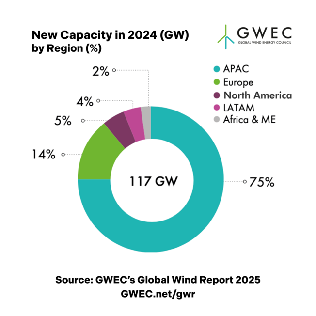 《2025 年全球风能报告》包括来自世界各个地区的数据。去年的增长——新增陆上风电109 GW 和海上风电8 GW——使全球风能累计装机容量达到1,136GW,遍布各大洲,去年有55个国家和地区安装了风电机组。