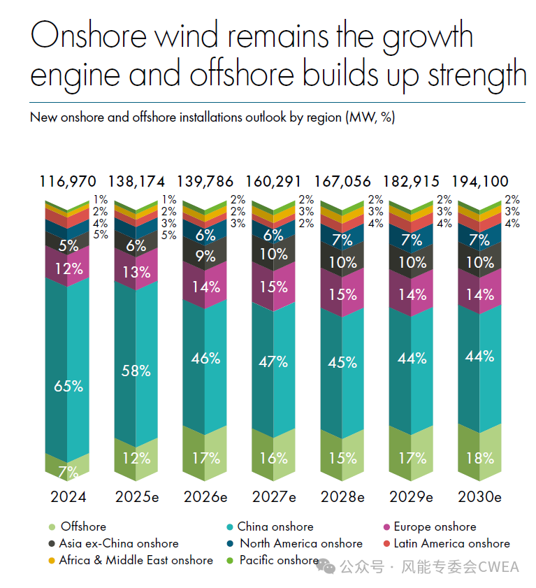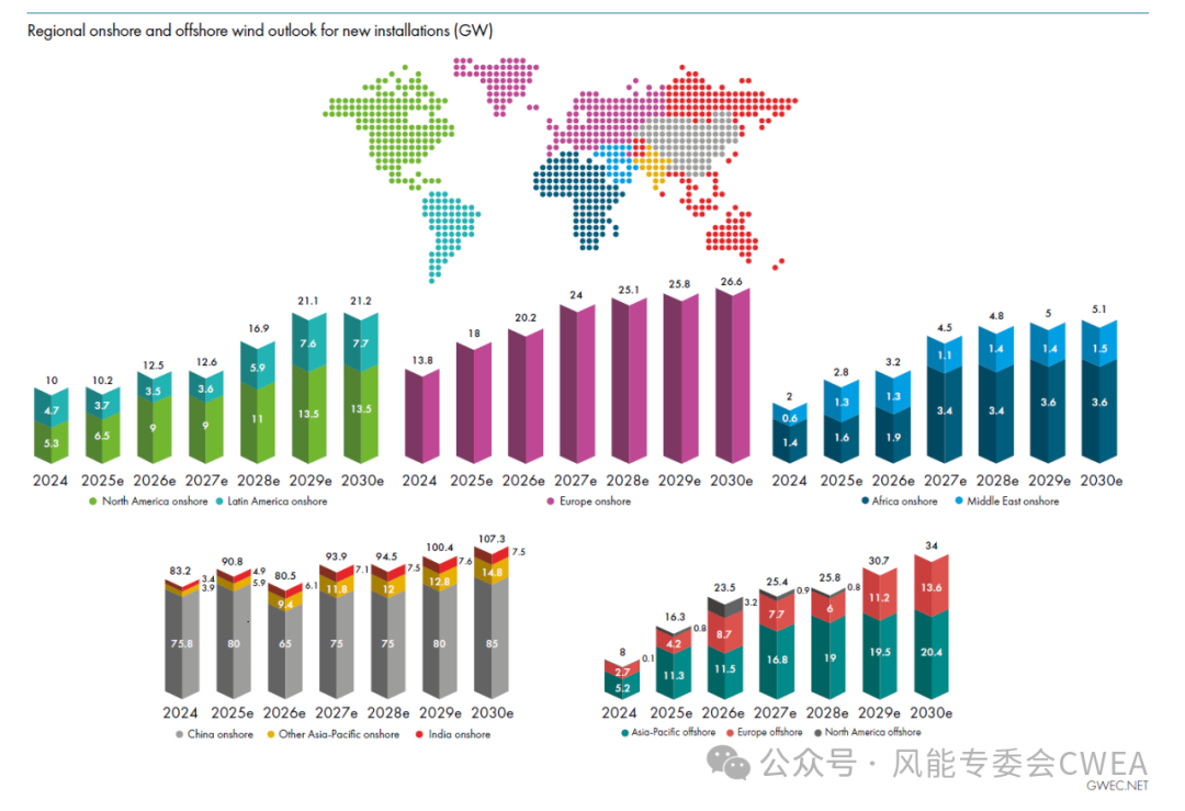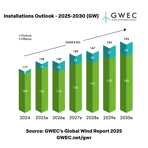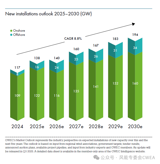 该报告预测,风能行业未来的复合年平均增长率为8.8%,这意味着到2030年,全球风能容量将增加981 GW。GWEC 的市场情报服务预计,到2030年,新装机容量将连续创下历史新高,2025年新增装机容量为138 GW,2026年为140 GW,2027年为160 GW,2028年为167 GW,2029年和2030年分别跃升至183 GW 和194 GW。
