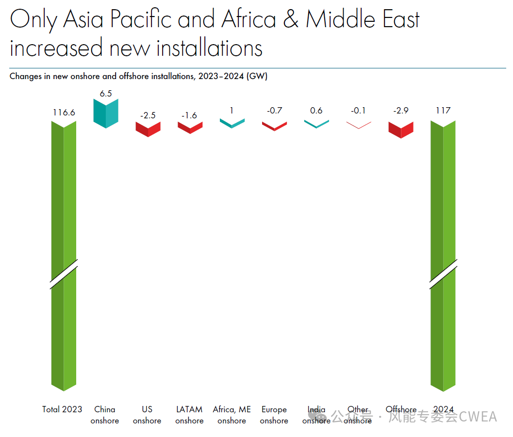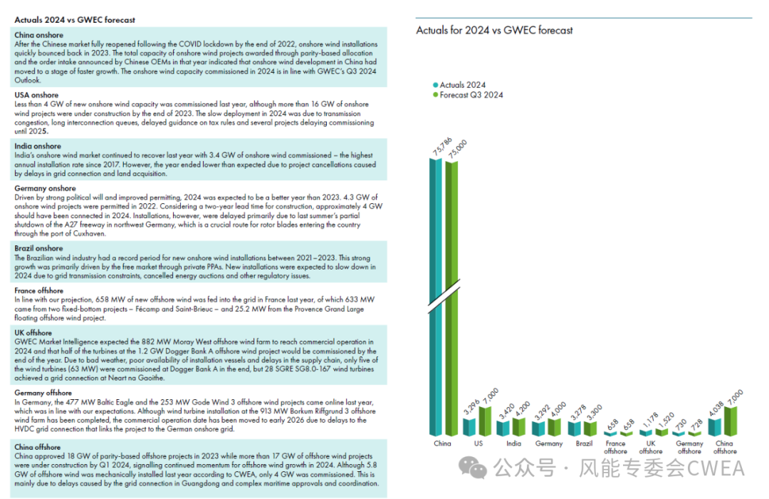 GWEC 指出,尽管2024年是风电装机量创纪录的一年,但总体数据掩盖了全球市场的巨大差异,其中大部分装机量发生在包括中国和欧洲在内的少数成熟市场。