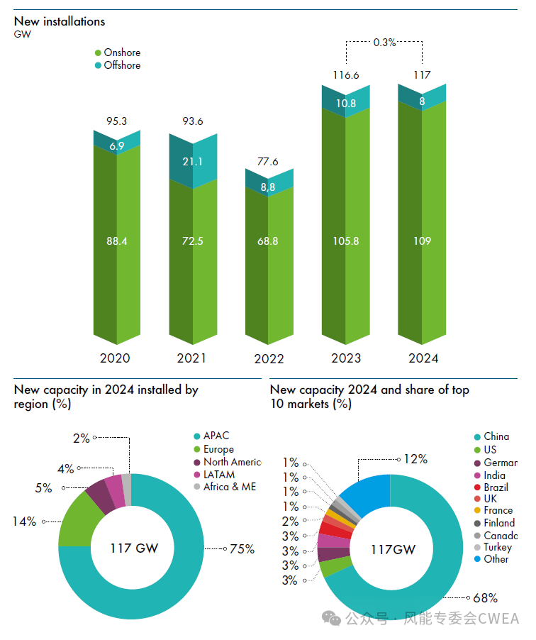 2025年4月23日,全球风能理事会(GWEC)在伦敦发布的《2025全球风能报告》显示,2024年是新增装机创纪录的一年,全球新增风电并网装机容量为117GW。