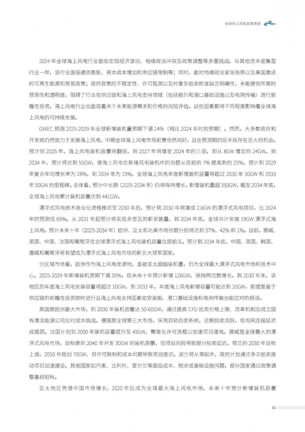 到2025年,海上风电装机容量将翻倍,到2027年将增至2024年的三倍,即从8GW增加到24GW。到2034年,预计将达到55GW, 使海上风电在新增风电装机中的份额从目前的7%提高到约25%。预计到2029年复合年均增长率为28%,到2034年为15%,全球海上风电年度新增装机容量将超过2030年30GW和2033年50GW的里程碑。