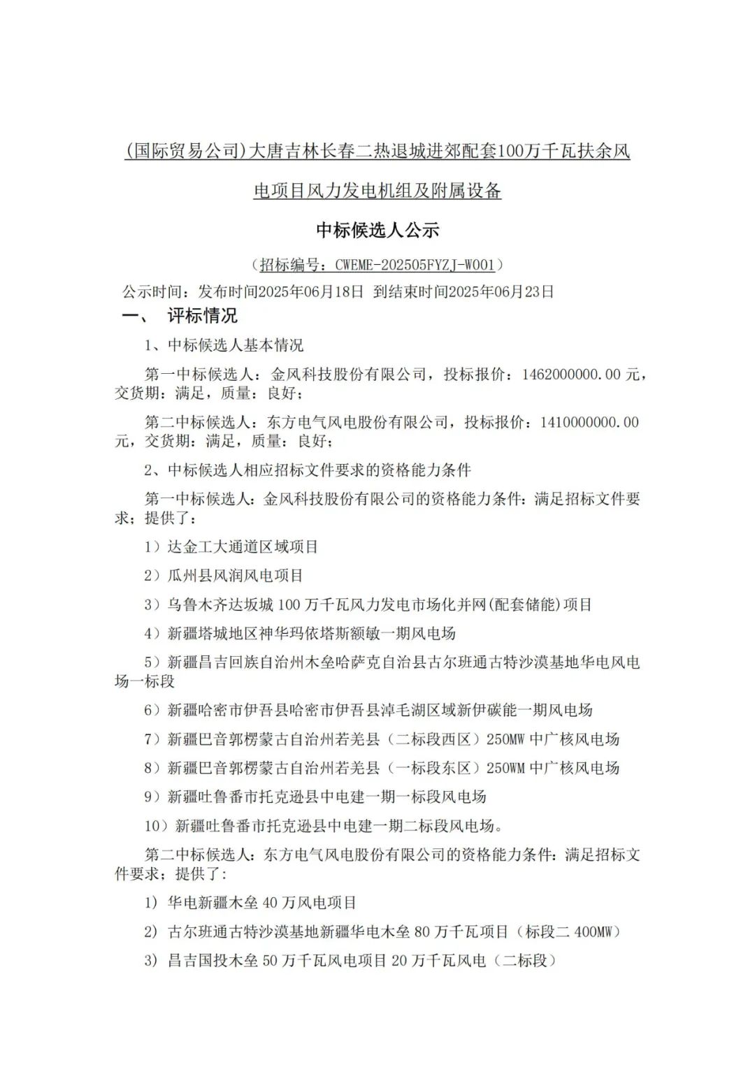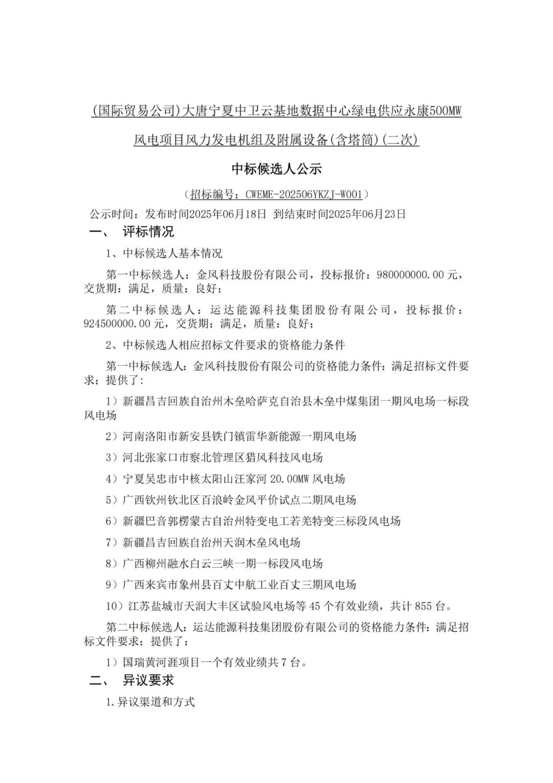 根据公示,远景能源、金风科技作为第一中标候选人预中标。