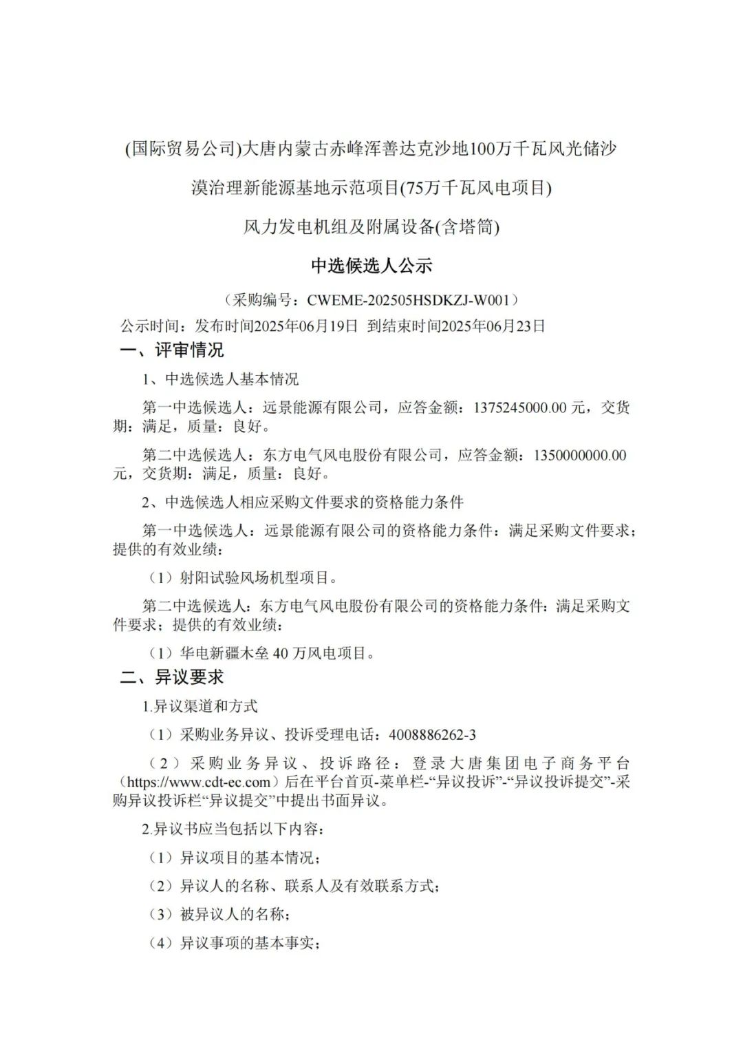 风电头条获悉,近日,大唐内蒙古赤峰浑善达克沙地100万千瓦风光储沙漠治理新能源基地示范项目(75万千瓦风电项目)、大唐吉林长春二热退城进郊配套100万千瓦扶余风电项目等3个风电项目中标候选人公示,项目规模合计2250MW,单机容量6.25MW-8.5MW。