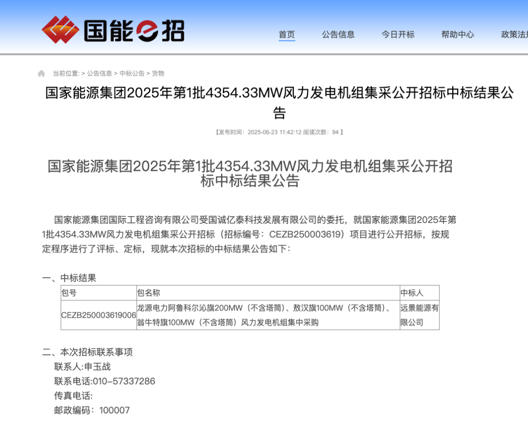 风电头条获悉,6月23日,国家能源集团2025年第1批4354.33MW风力发电机组集采公开招标中标结果公告。