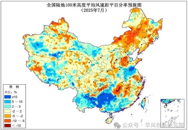 图1.2 2025年7月全国陆地100米高度平均风速距平百分率预报图