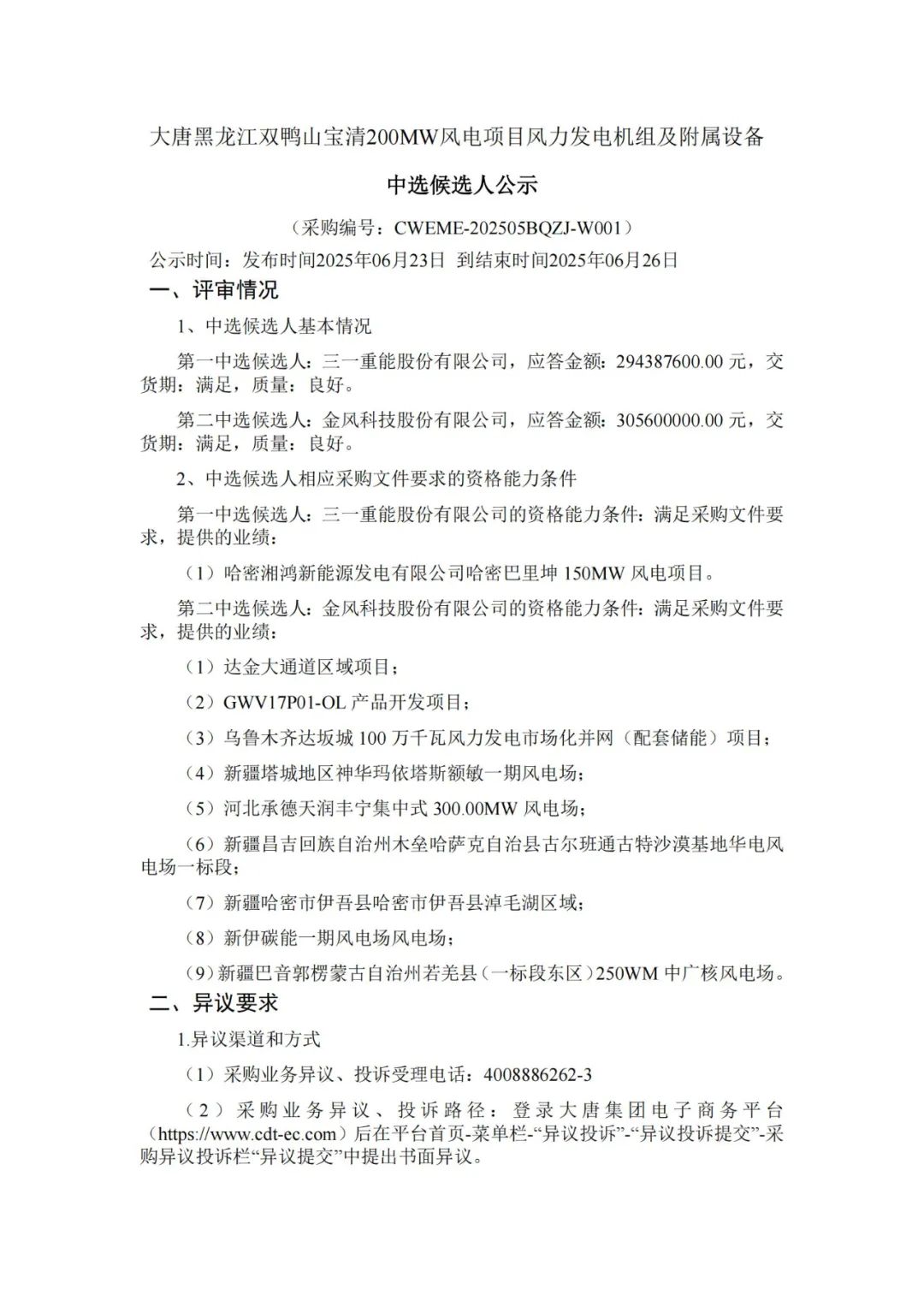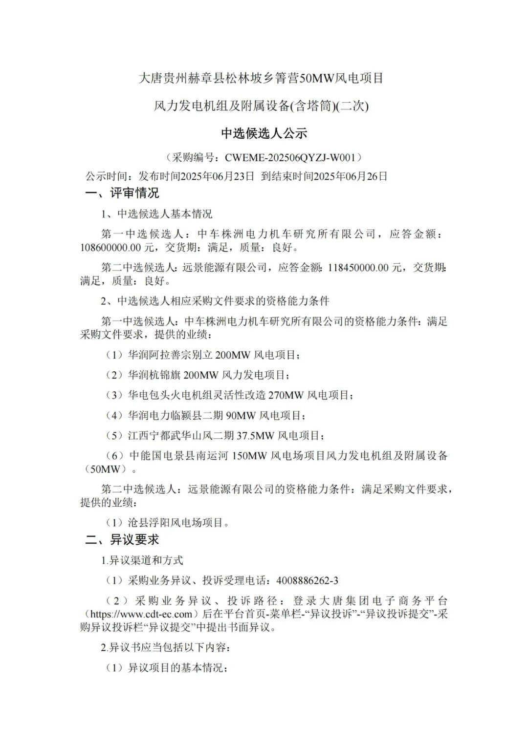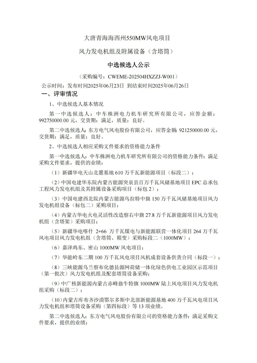 根据公示,三一重能、中车株洲所、远景能源作为第一中标候选人预中标。