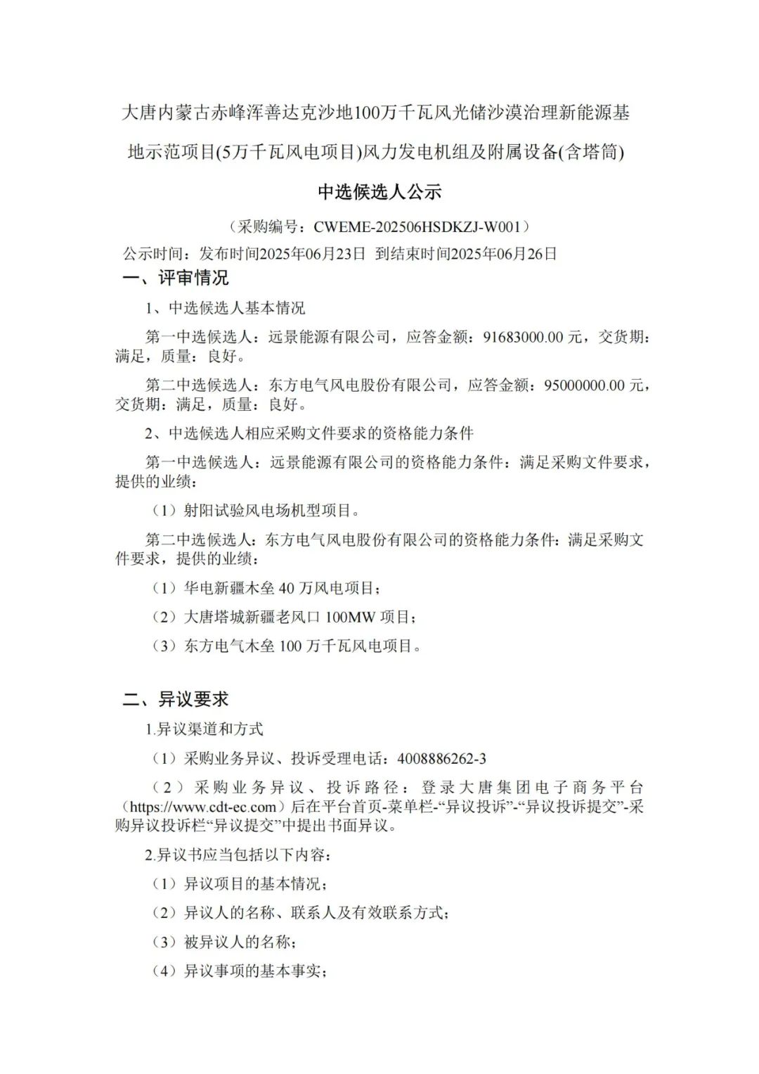 大唐内蒙古赤峰浑善达克沙地100万千瓦风光储沙漠治理新能源基地示范项目(5万千瓦风电项目)位于内蒙古自治区赤峰市,采购容量50MW,不允许上下浮动,8.3MW≤单机容量≤8.35MW,允许一台机组降容运行,匹配总容量要求;不允许混排;风机总台数6台;叶轮直径≥220米,轮毂高度≤140米;限定刚性普通钢塔(不接受分片式钢塔)。交货日期:2025年9月1日开始供货,2025年11月10日供货完毕。