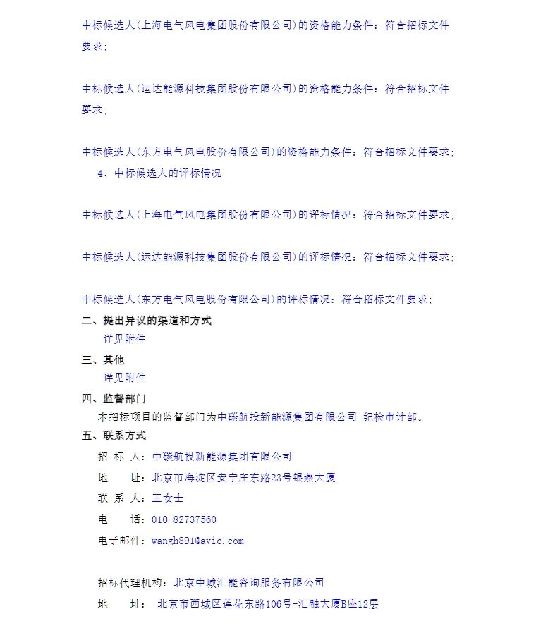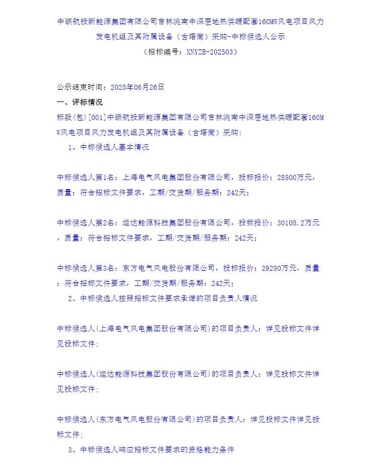 风电头条获悉,近日,中碳航投新能源集团有限公司吉林洮南中深层地热供暖配套160MW风电项目、怀安龙洞150MW风储项目风力发电机组设备及附属设备采购采购中标候选人公示,项目规模合计310MW。