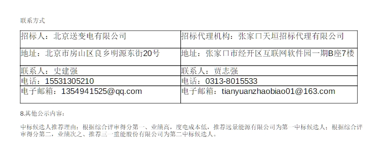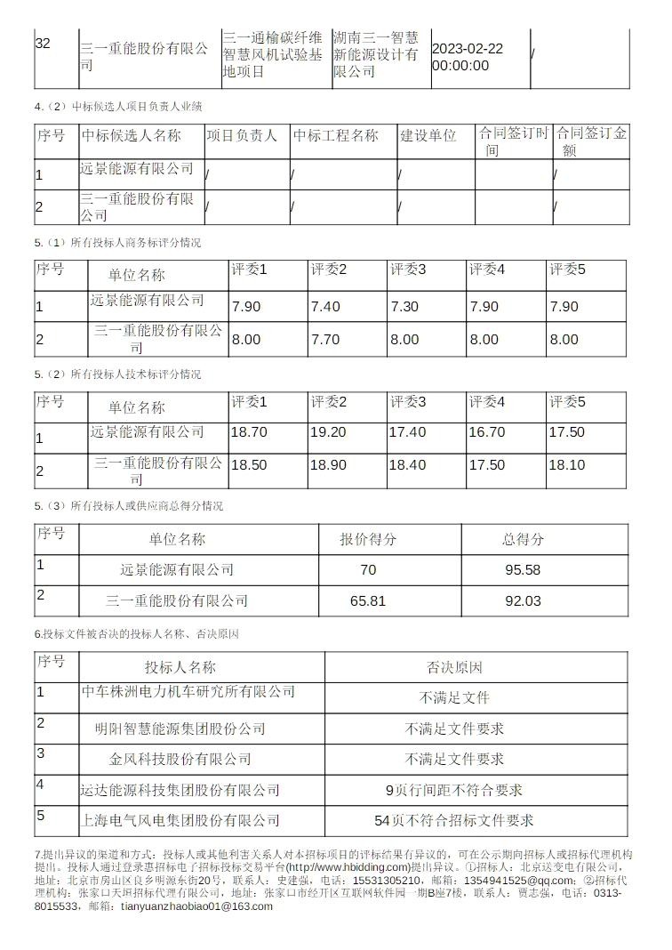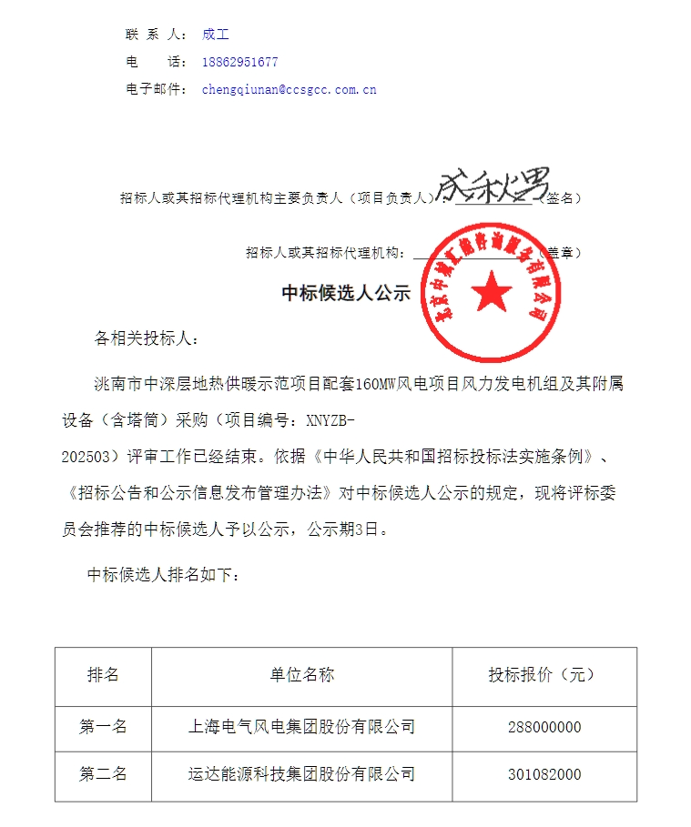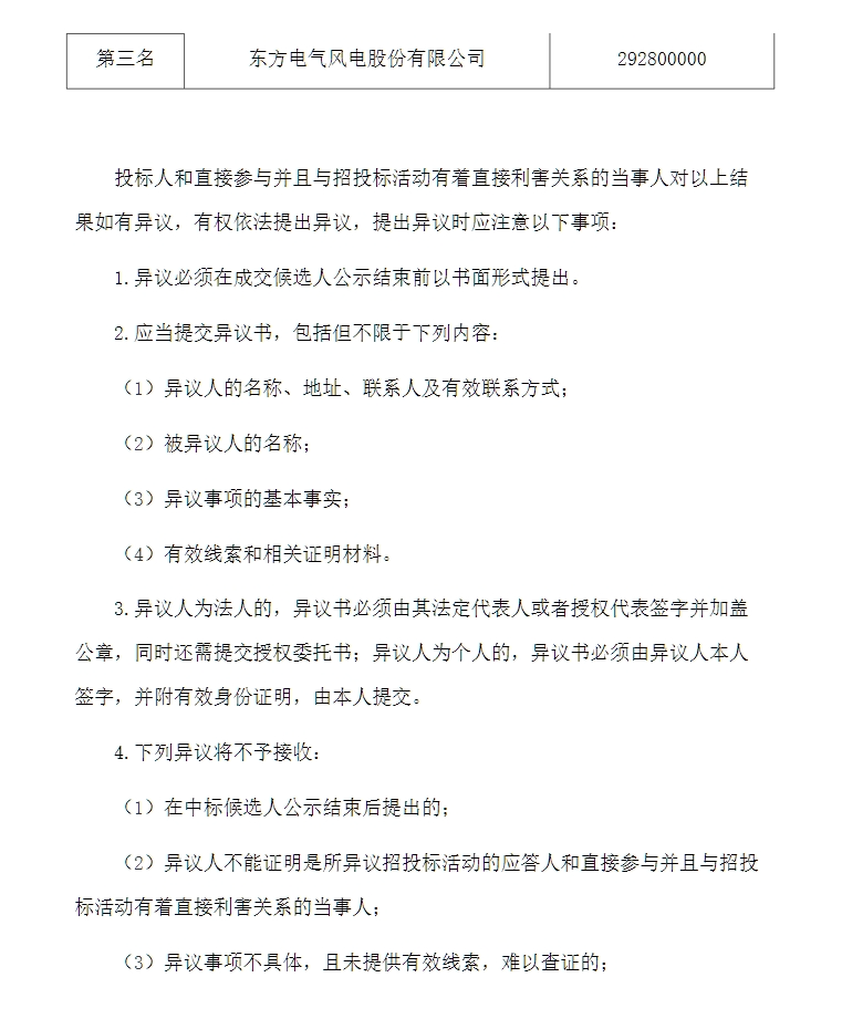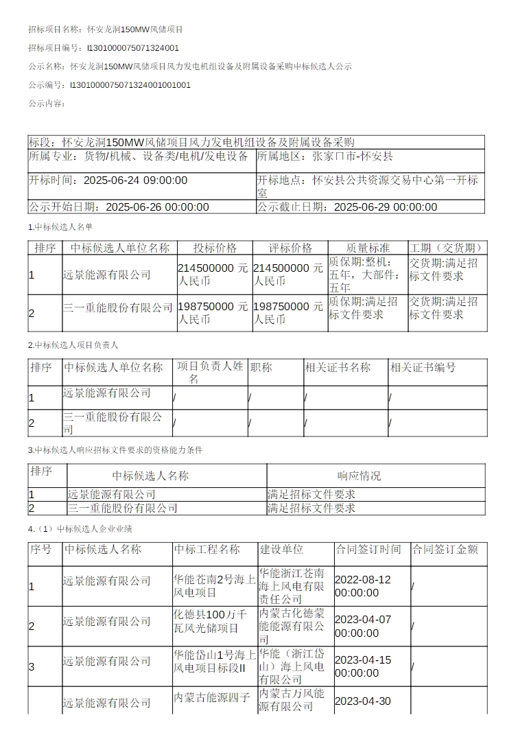 根据公示,电气风电、远景能源作为第一中标候选人预中标。