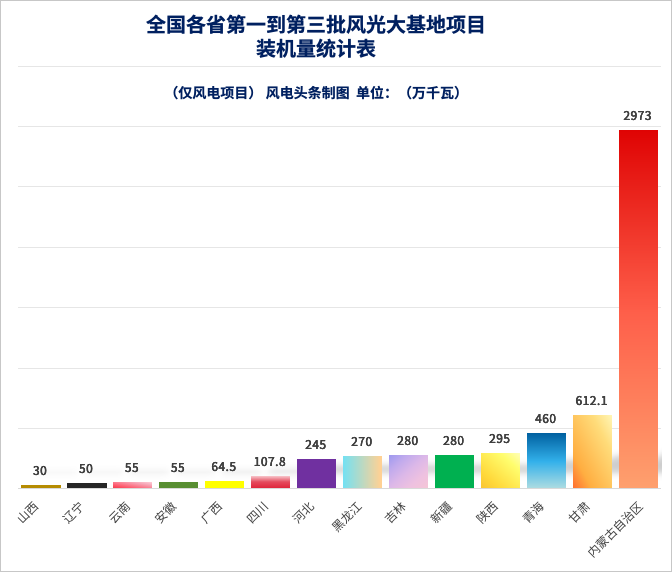 风电头条发现,三批风光大基地建设过程中,区域差异明显。已经布局的三批风光大基地项目中,风电项目装机规模最大的地区在内蒙古自治区,已经公布业主的风电项目规模达到2973万千瓦,其中包括预备项目。