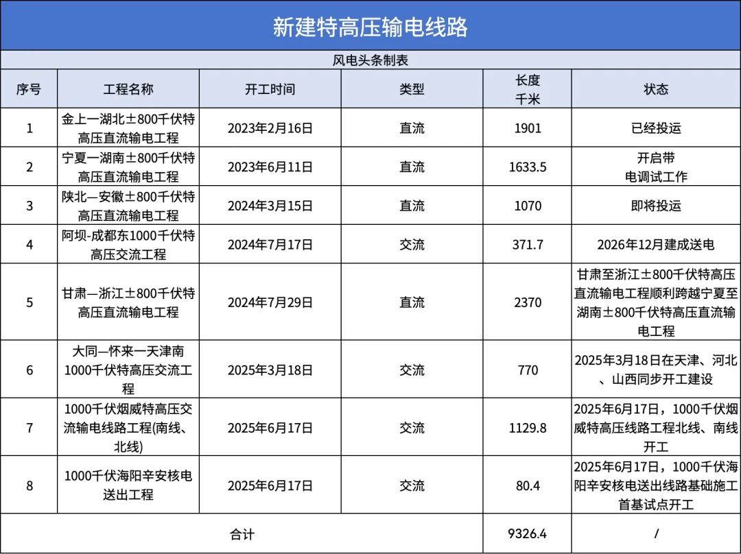 为解决远距离输电难题,国家电网也在不断加大特高压输电线路投资。截至目前,金上-湖北线路已经投运,陕北—安徽线路也即将投运。从2023年到2025年6月,国内新增规划和建设的特高压输电线路有8条,合计长度达到9326.4千米。