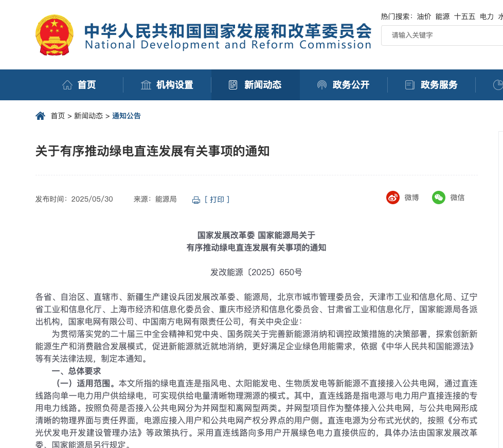 2025 年 6 月,国家发展改革委、国家能源局公布《关于有序推动绿电直连发展有关事项的通知》,其中提到:“风电、太阳能发电、生物质发电等新能源不直接接入公共电网,而通过直连线路向单一电力用户供给绿电。”