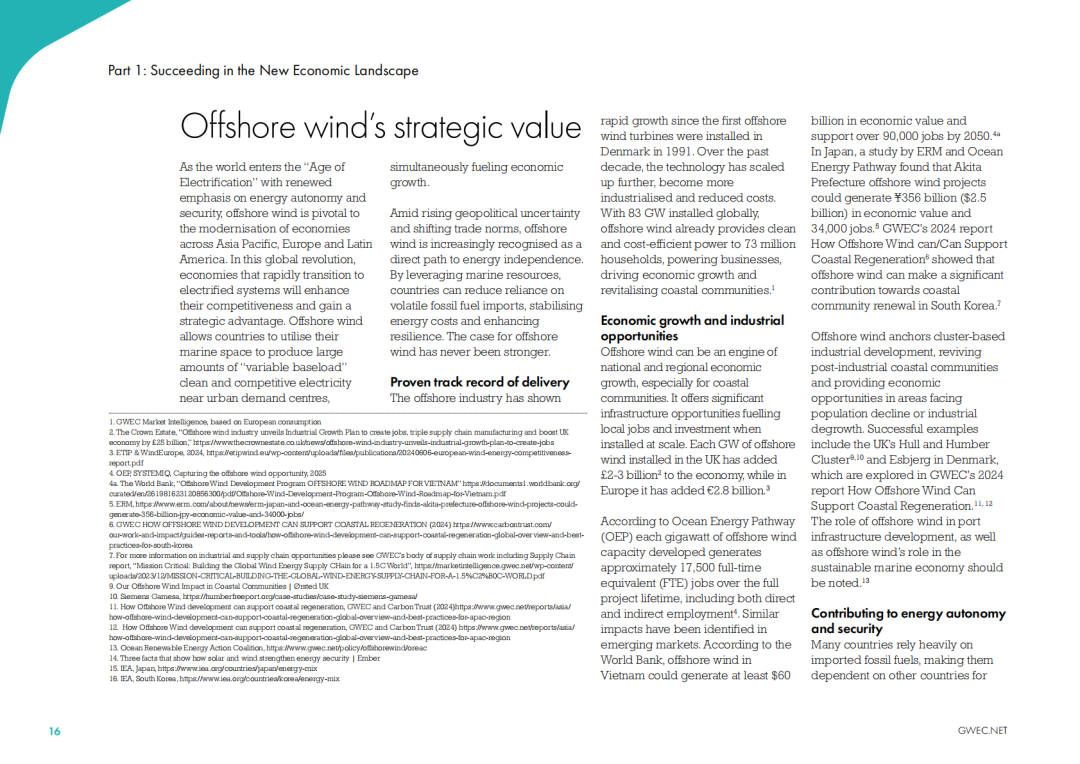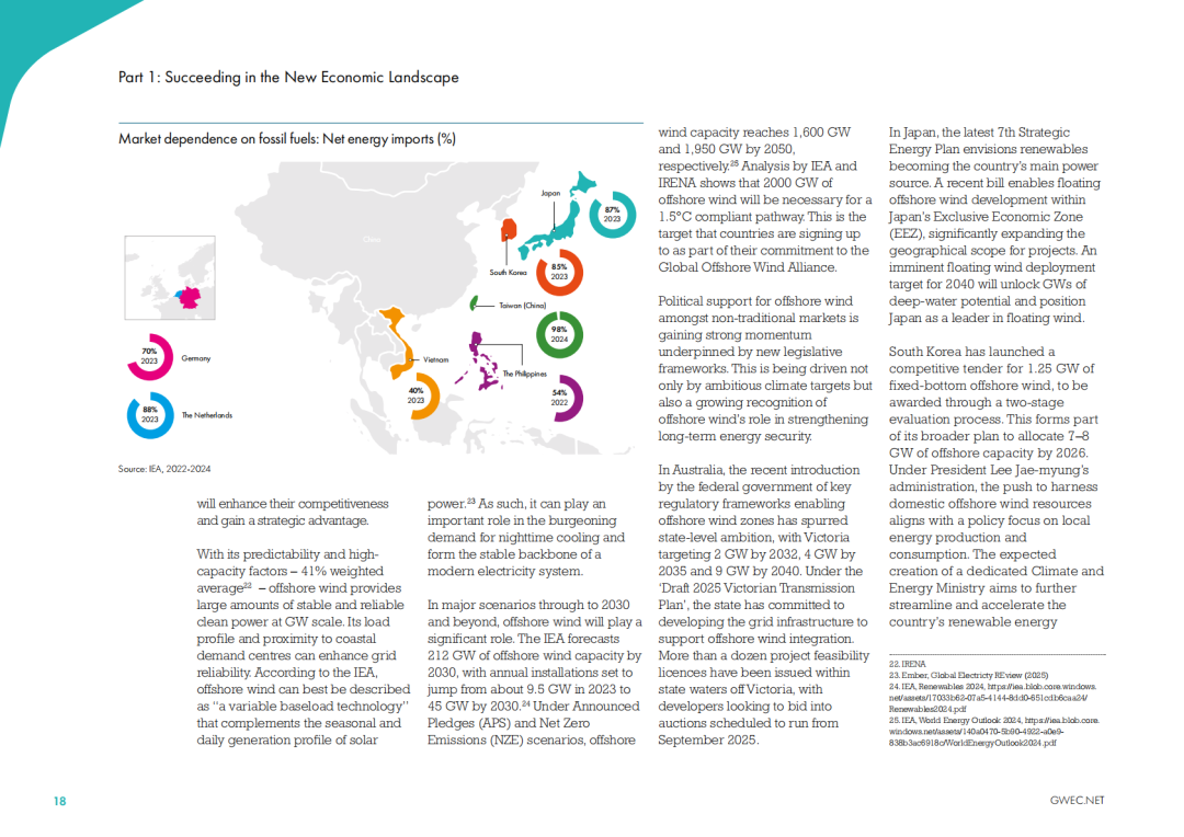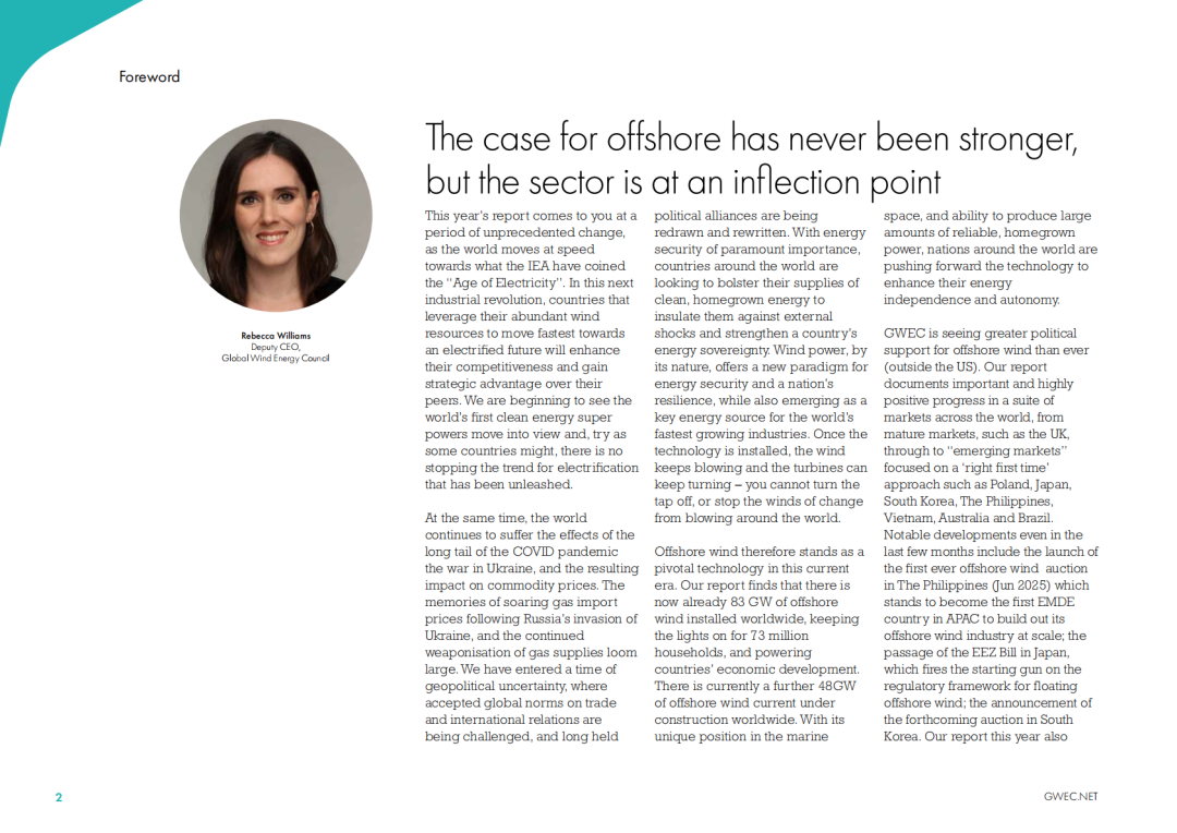 尽管近期的增长仍将主要来自欧洲和中国,但GWEC报告显示,海上风电正在向亚太和拉美等新兴市场推进。在日本、韩国、菲律宾、越南、澳大利亚、巴西和哥伦比亚,政府正与行业合作,以建立政策和法规,加快海上风电的发展。这表明了政策制定者的承诺,也为行业的下一个发展浪潮奠定了基础。