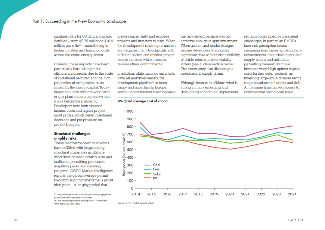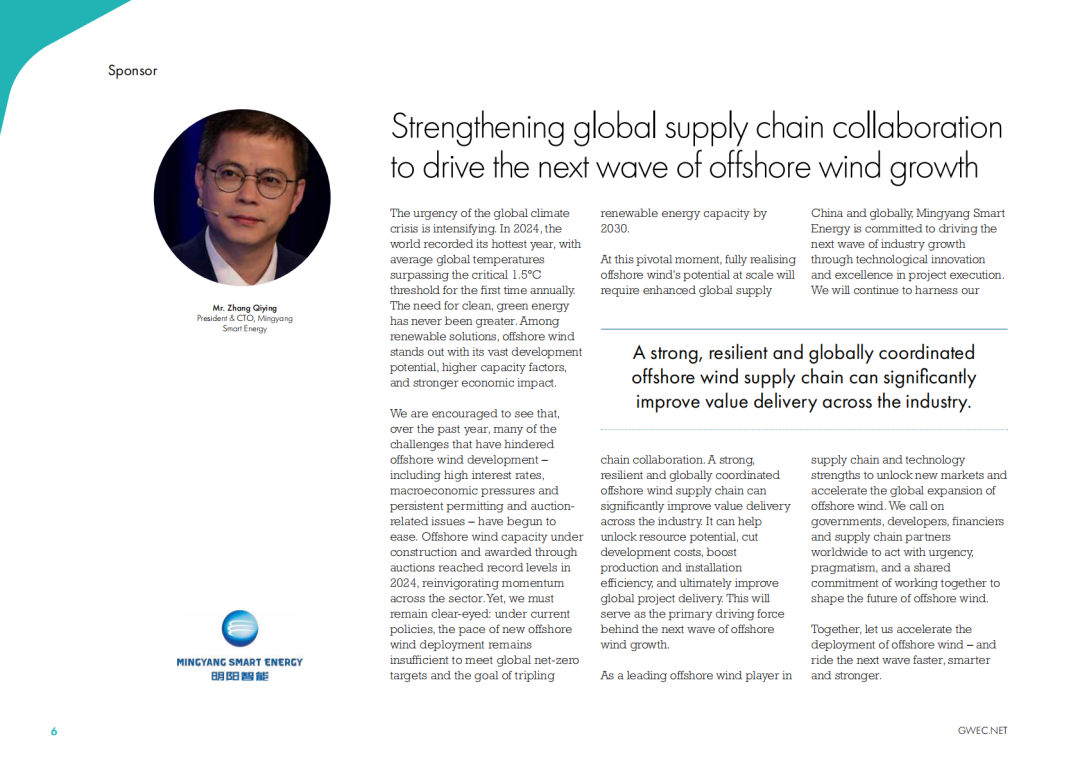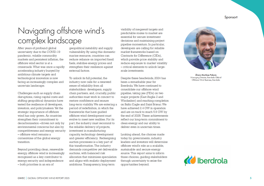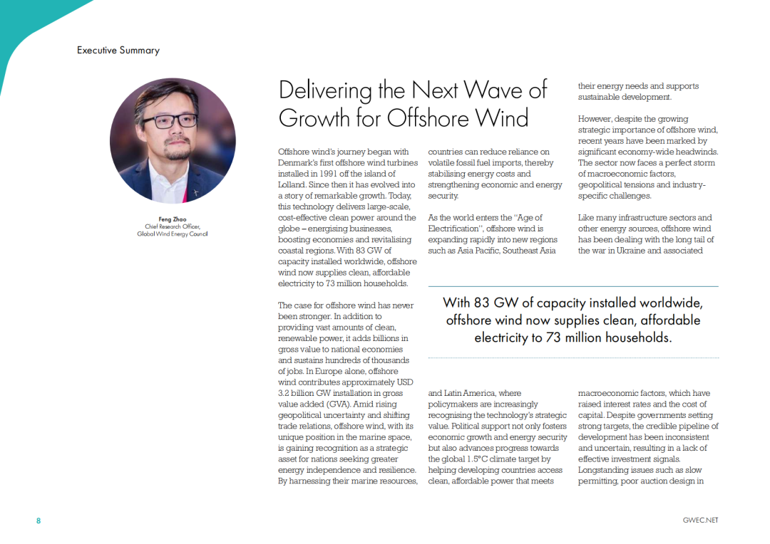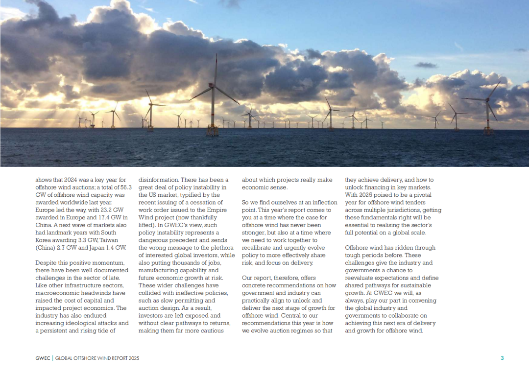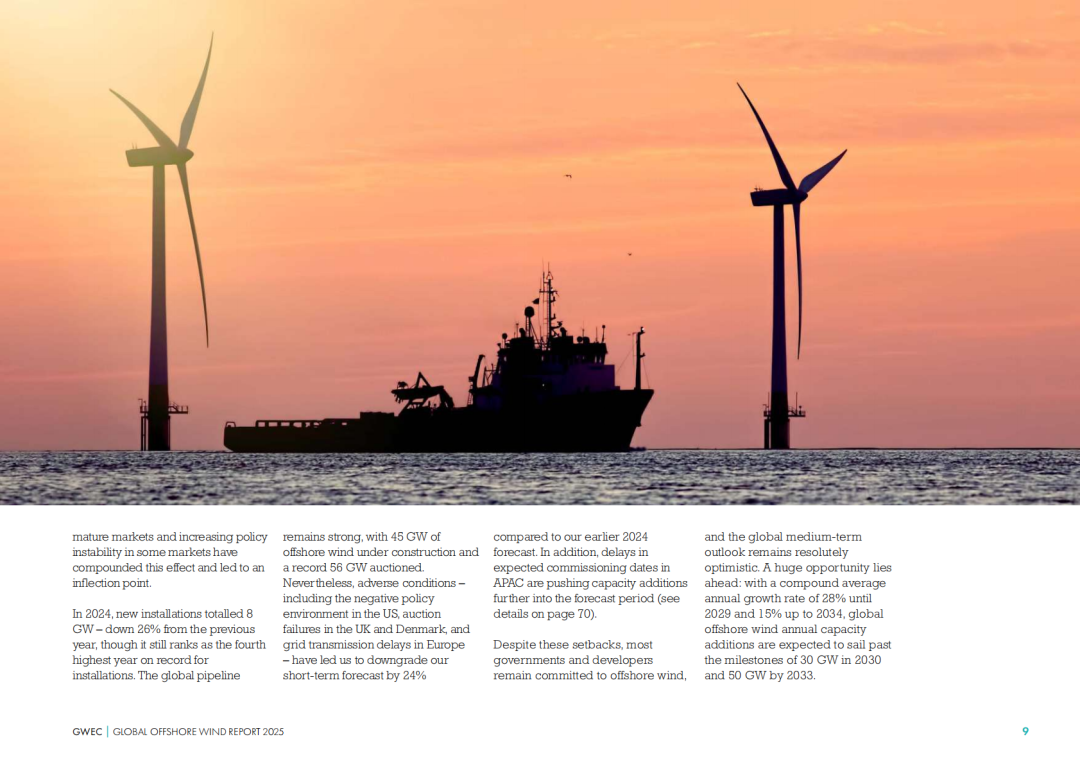 “2024年全球新增8GW的海上风电并网容量,这一数据比前一年减少了26%,但仍使2024年成为海上风电新增装机历史第四高的年份。”